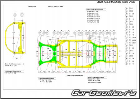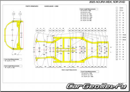 The factory body repair manual contains body dimensions for the Acura MDX 2021-2027 and includes description of various body parts replacement, body dimension, control points for the Acura MDX.
