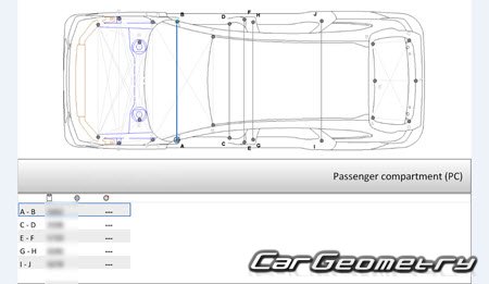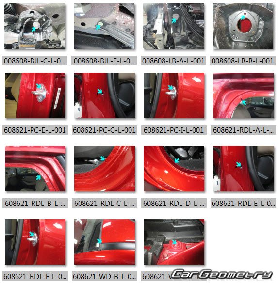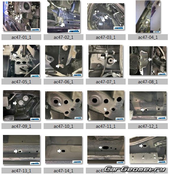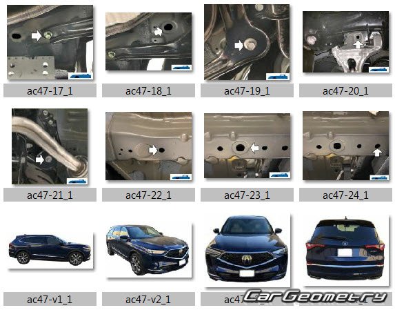 Information for the Acura MDX 2021-2027 body geometric dimensions, control points, images of body elements, materials used, recommendations on applicable types, methods and materials for the welding points; places and materials for applying seam, soundproof and anti-corrosion sealants; points and directions for pre-cuts of body parts for the future installation of the new ones; types of interior materials, definitions and decoding.