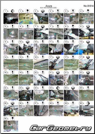 Selection from factory documentation and vehicle measurement database for Acura ADX 2025-2030: body dimensions and geometry measurement points (chassis diagrams, upper body datasheet, underbody datasheet).