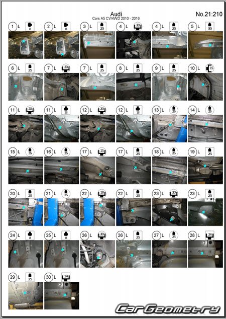 The factory body repair manual contains body dimensions for the Audi A5 Quattro (8T) Cabrio 2009-2015 and includes description of various body parts replacement, body dimension, control points for the Audi A5 Cabrio.