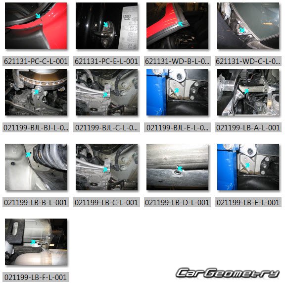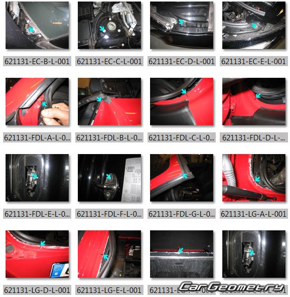 Information for the Audi TT 2007–2014 body geometric dimensions, control points, images of body elements, materials used, recommendations on applicable types, methods and materials for the welding points; places and materials for applying seam, soundproof and anti-corrosion sealants; points and directions for pre-cuts of body parts for the future installation of the new ones; types of interior materials, definitions and decoding.