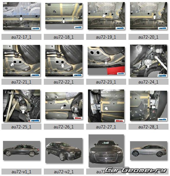Information for the Audi A6 2018-2025 body geometric dimensions, control points, images of body elements, materials used, recommendations on applicable types, methods and materials for the welding points; places and materials for applying seam, soundproof and anti-corrosion sealants; points and directions for pre-cuts of body parts for the future installation of the new ones; types of interior materials, definitions and decoding.