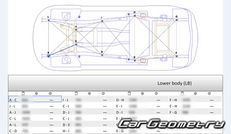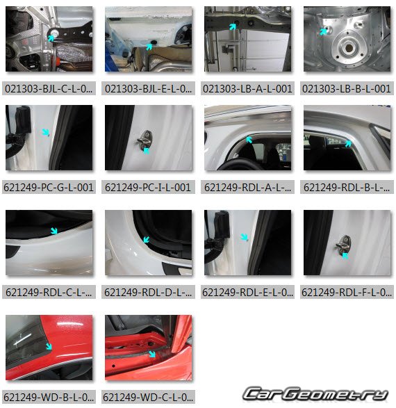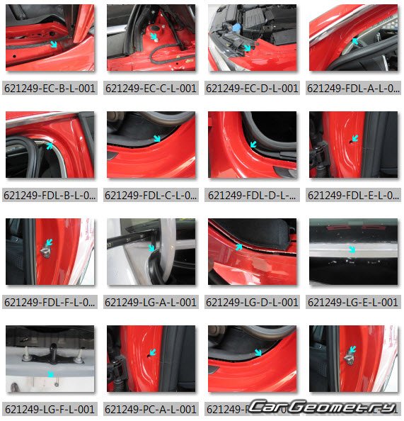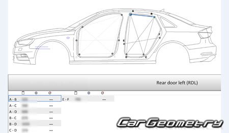 Information for the Audi A3 LIMOUSINE body geometric dimensions, control points, images of body elements, materials used, recommendations on applicable types, methods and materials for the welding points; places and materials for applying seam, soundproof and anti-corrosion sealants; points and directions for pre-cuts of body parts for the future installation of the new ones; types of interior materials, definitions and decoding.