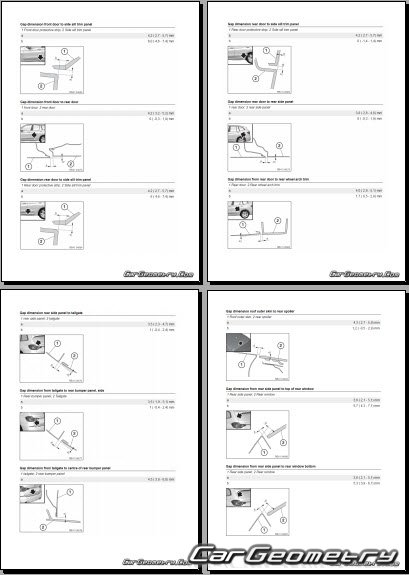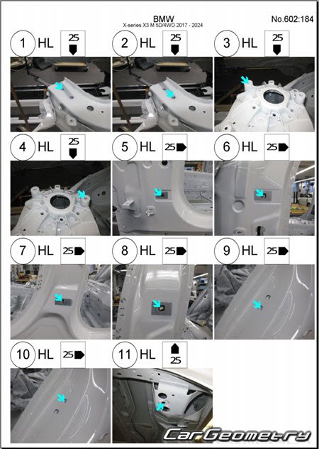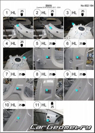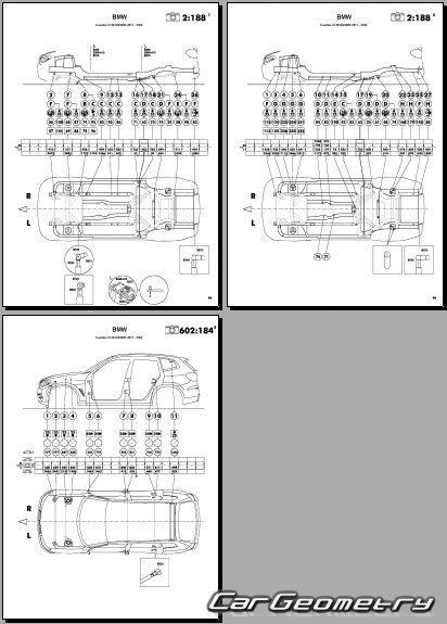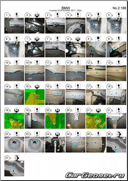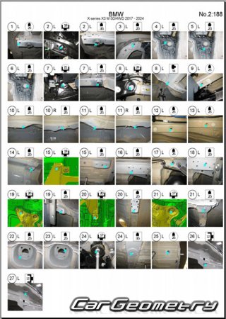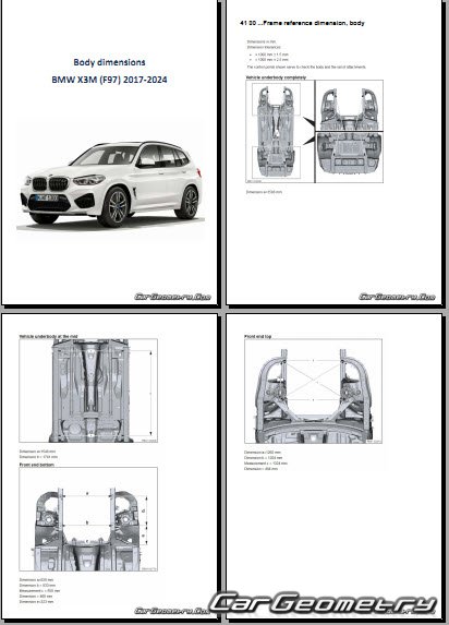 Body dimensions for restoring the body geometry of BMW X3M Competition (F97) 2017-2024. With the help of this information, you can check the geometry of the damaged body, as well as carry out restoration work on the straightening of cars.