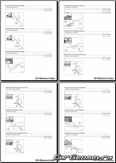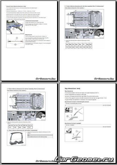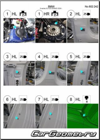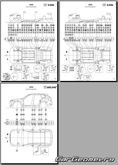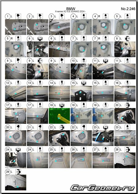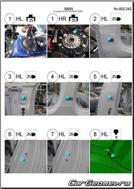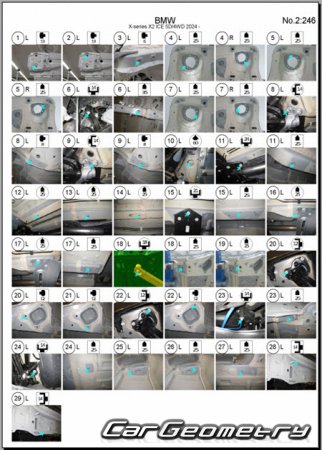 Body dimensions for restoring the body geometry of BMW X2 (U10) 2024–2030. With the help of this information, you can check the geometry of the damaged body, as well as carry out restoration work on the straightening of cars.