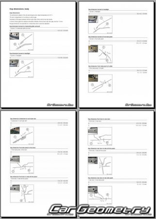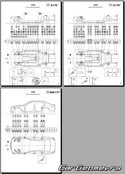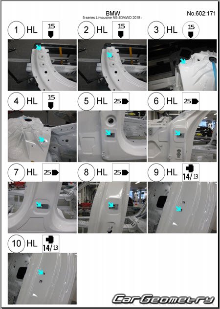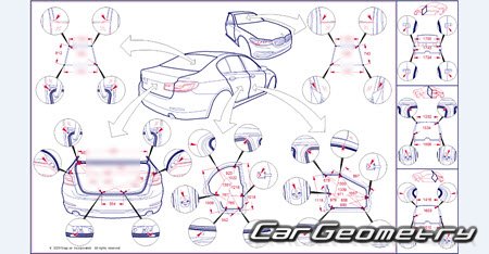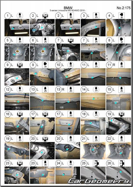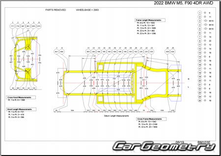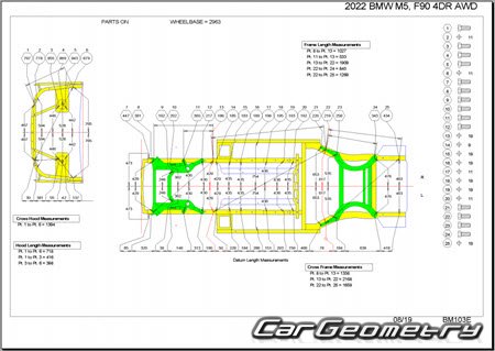 Body dimensions for restoring the body geometry of BMW M5 (F90) 2018-2024. With the help of this information, you can check the geometry of the damaged body, as well as carry out restoration work on the straightening of cars.