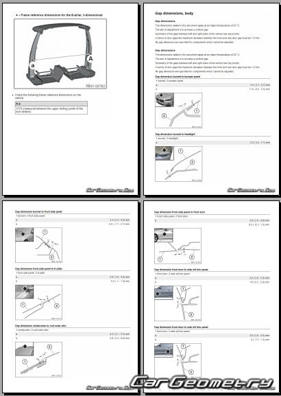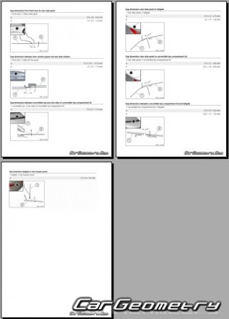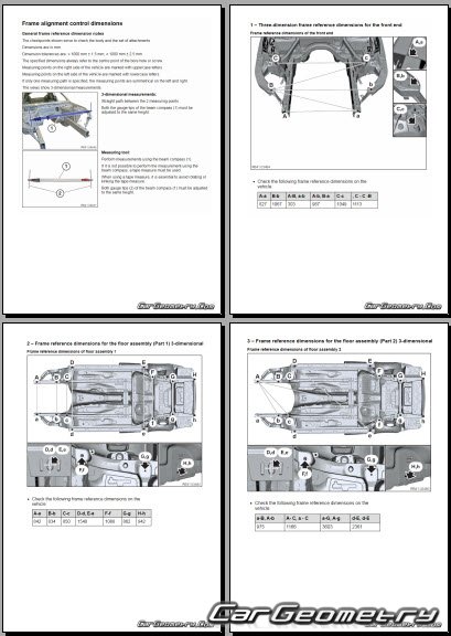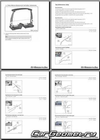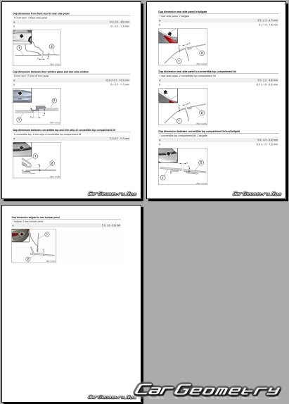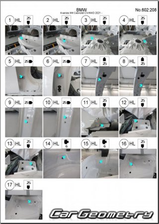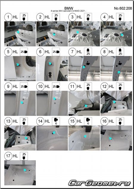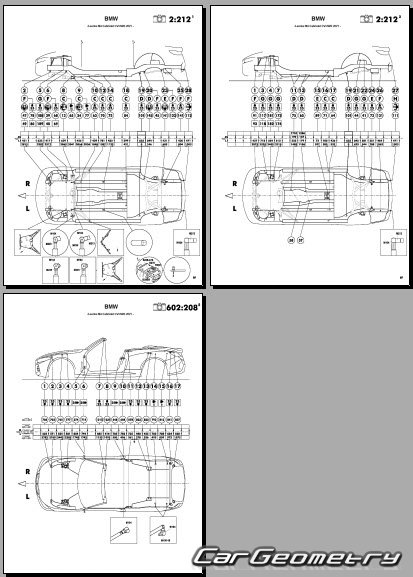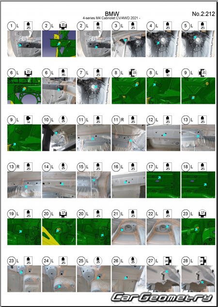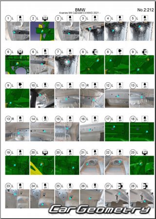 Body dimensions for restoring the body geometry of BMW M4 (G83) Cabrio 2021-2027. With the help of this information, you can check the geometry of the damaged body, as well as carry out restoration work on the straightening of cars.