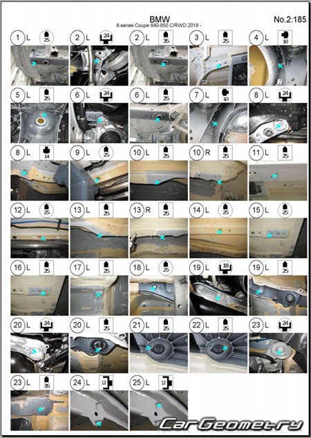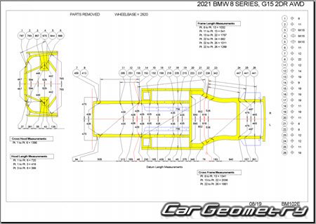 Body dimensions for restoring the body geometry of BMW 8 Series (G15) Coupe 2019-2024. With the help of this information, you can check the geometry of the damaged body, as well as carry out restoration work on the straightening of cars.