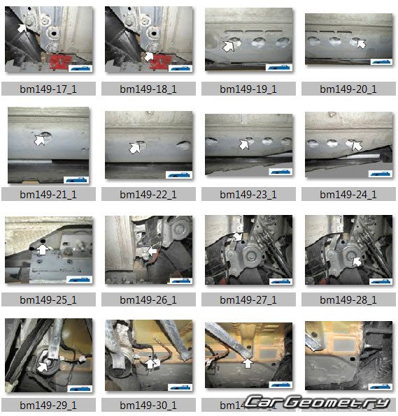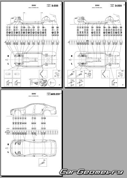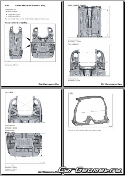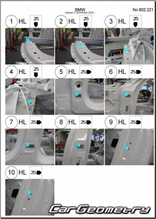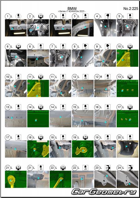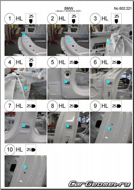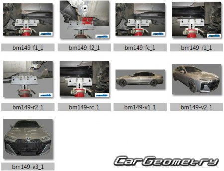 Body dimensions for restoring the body geometry of BMW I7 (G70) 2023-2031. With the help of this information, you can check the geometry of the damaged body, as well as carry out restoration work on the straightening of cars.