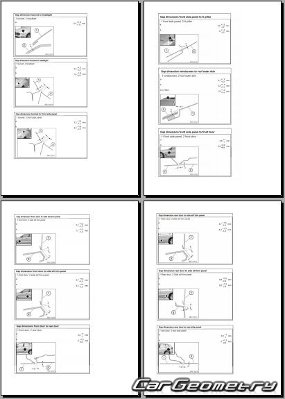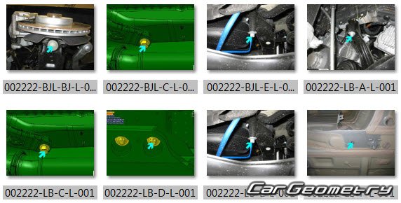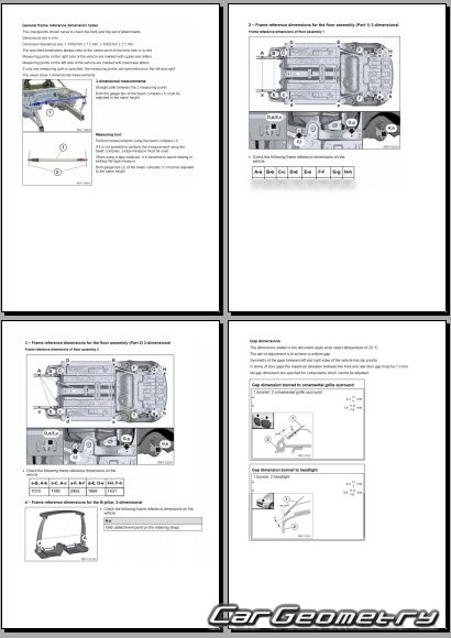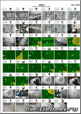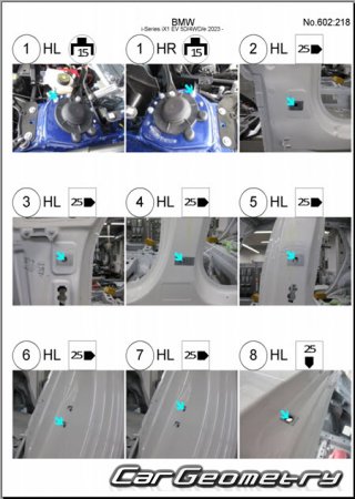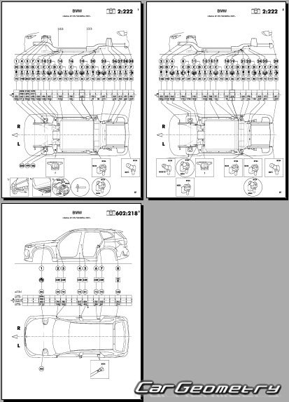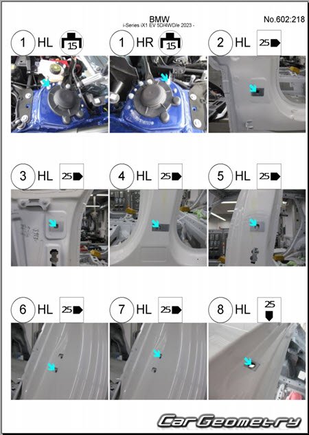 Body dimensions for restoring the body geometry of BMW iX1 EV (U11) 2022-2028. With the help of this information, you can check the geometry of the damaged body, as well as carry out restoration work on the straightening of cars.