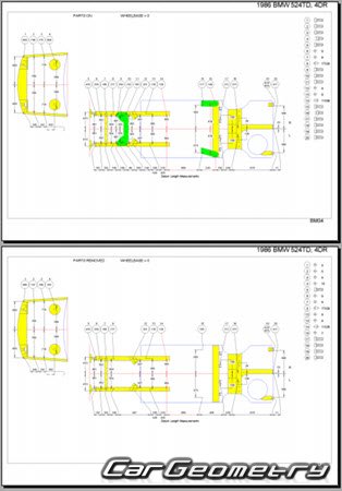 Body dimensions for restoring the body geometry of BMW 5 Series (E28) 1981–1988. With the help of this information, you can check the geometry of the damaged body, as well as carry out restoration work on the straightening of cars.