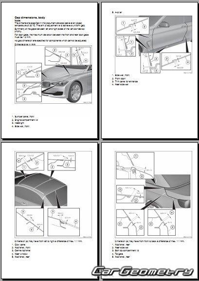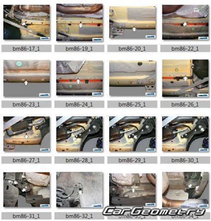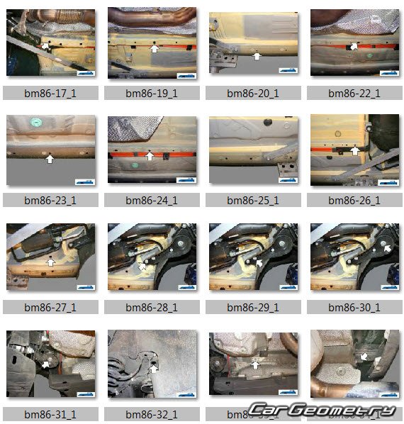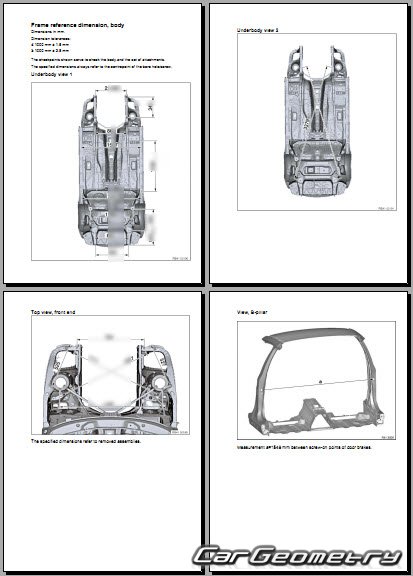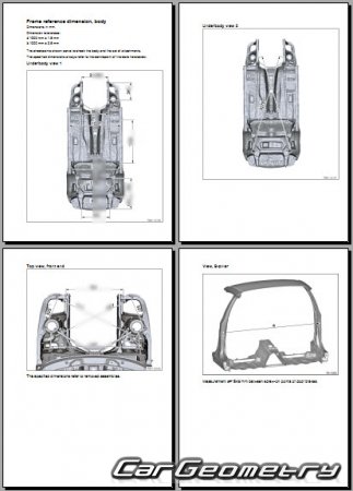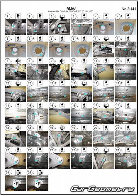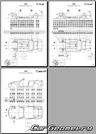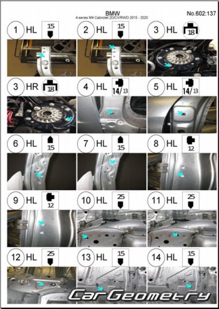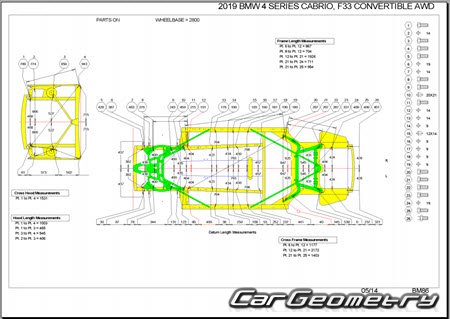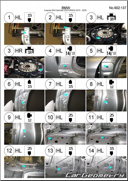 Body dimensions for restoring the body geometry of BMW M4 (F83) Cabriolet 2015-2020. With the help of this information, you can check the geometry of the damaged body, as well as carry out restoration work on the straightening of cars.