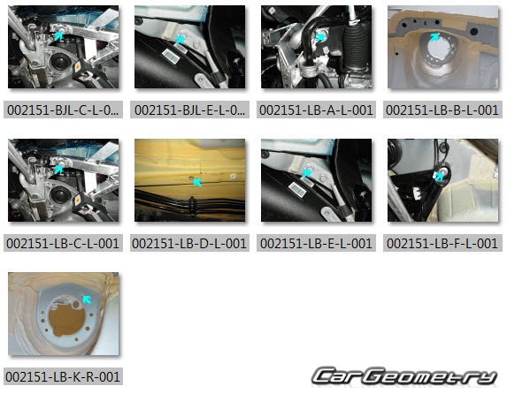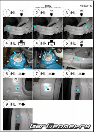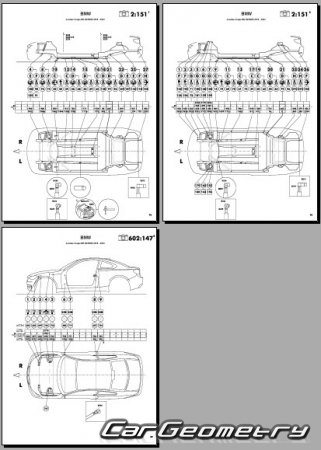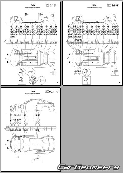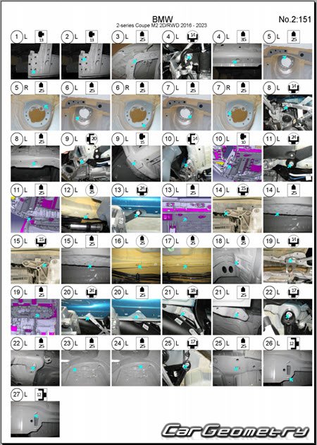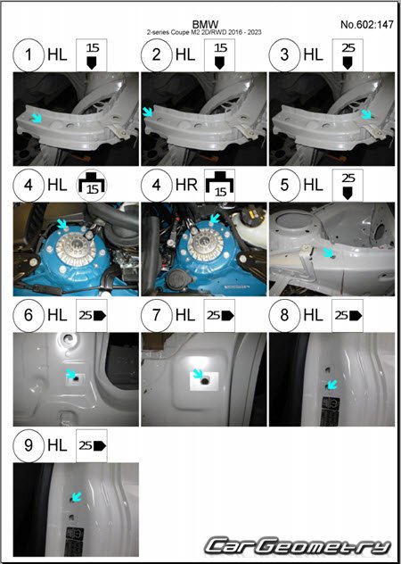 Body dimensions for restoring the body geometry of BMW M2 (F87) 2016-2023. With the help of this information, you can check the geometry of the damaged body, as well as carry out restoration work on the straightening of cars.