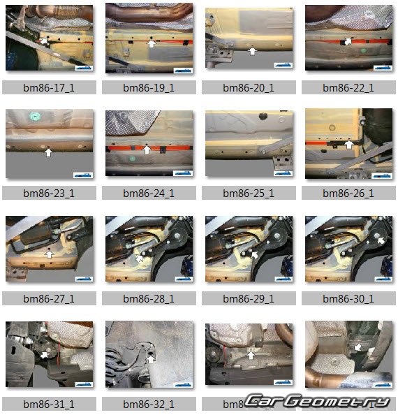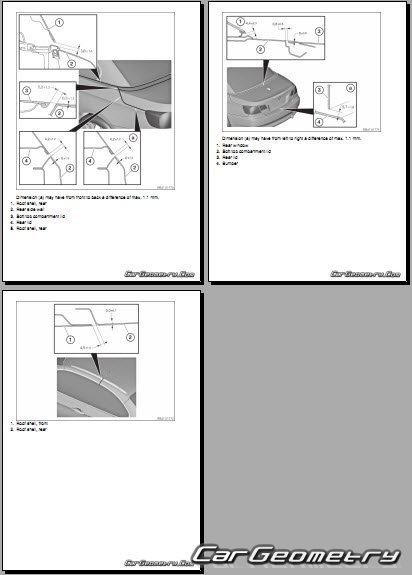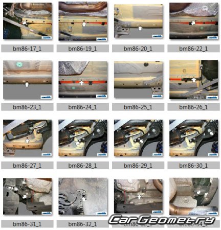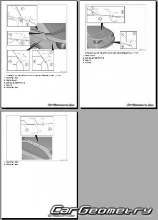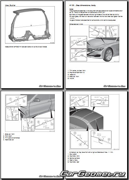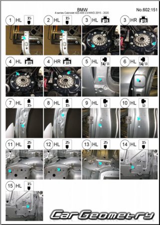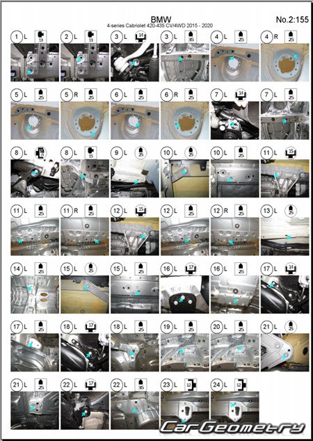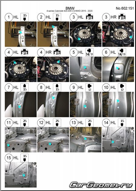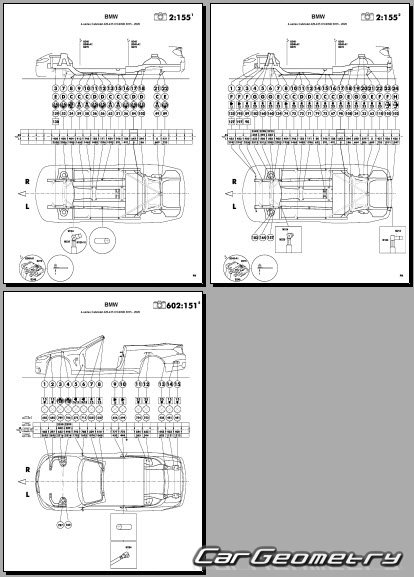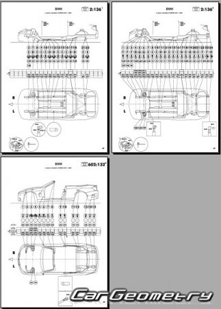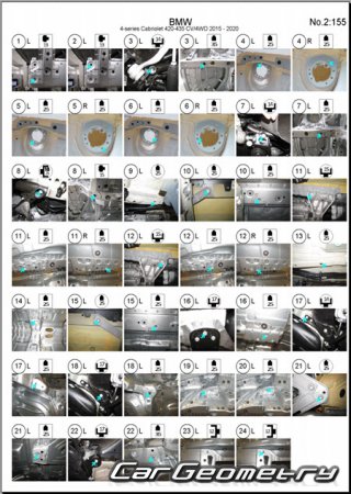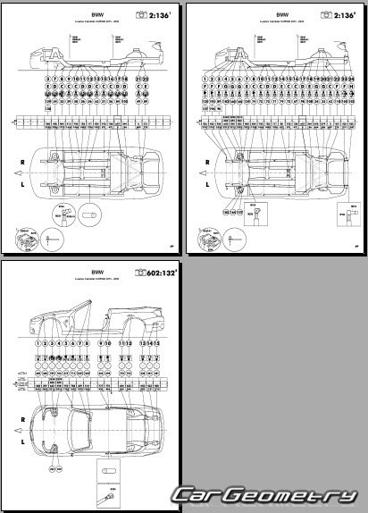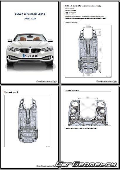 Body dimensions for restoring the body geometry of BMW 4 Series (F33) Cabrio 2013-2020. With the help of this information, you can check the geometry of the damaged body, as well as carry out restoration work on the straightening of cars.