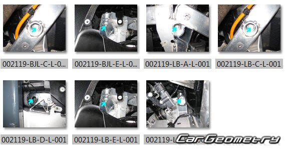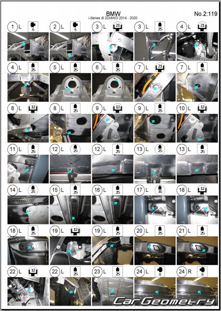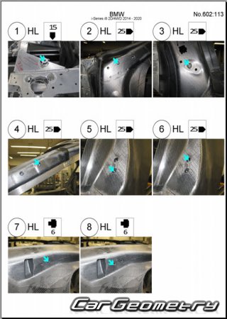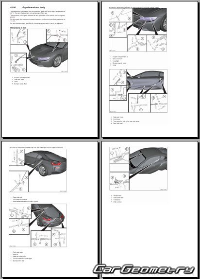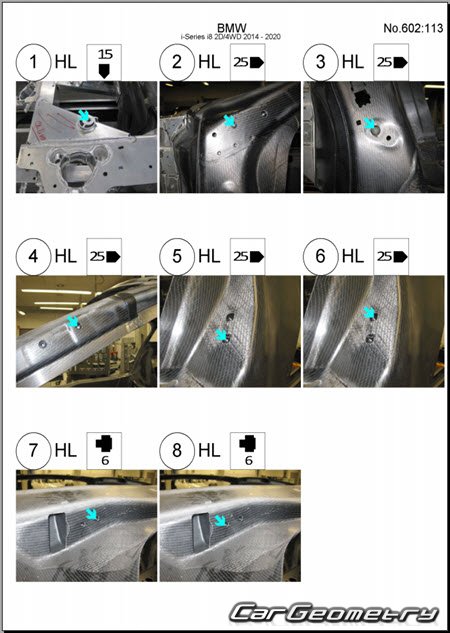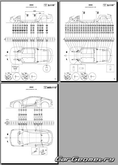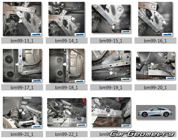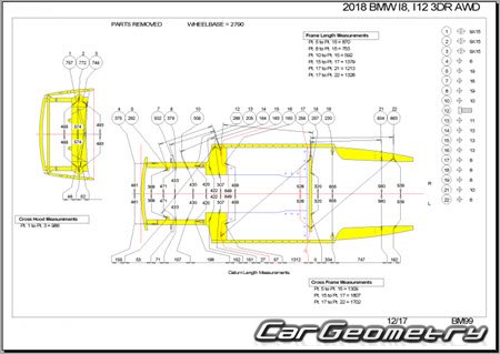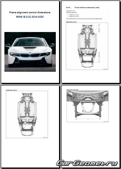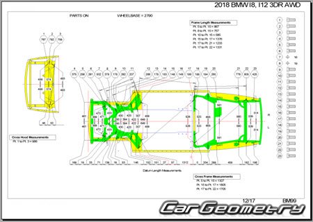 Body dimensions for restoring the body geometry of BMW i8 (I12) 2014-2020. With the help of this information, you can check the geometry of the damaged body, as well as carry out restoration work on the straightening of cars.