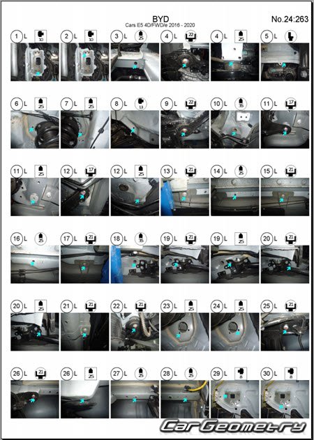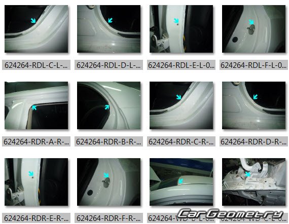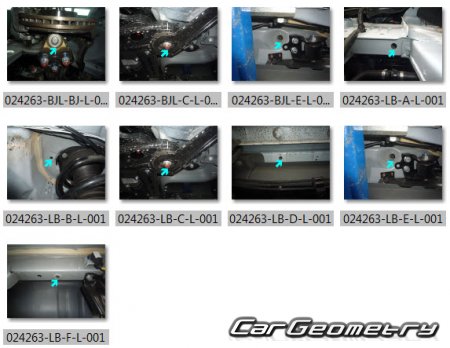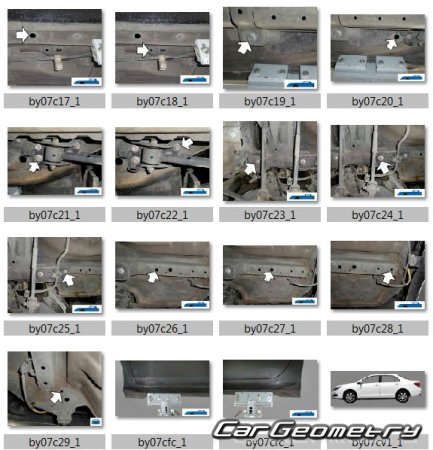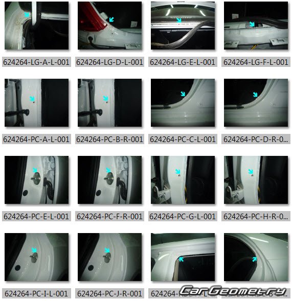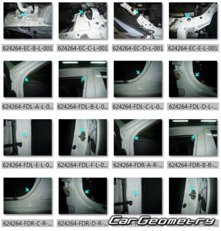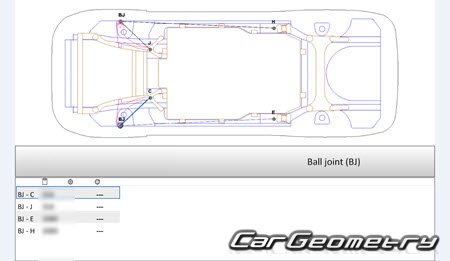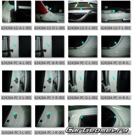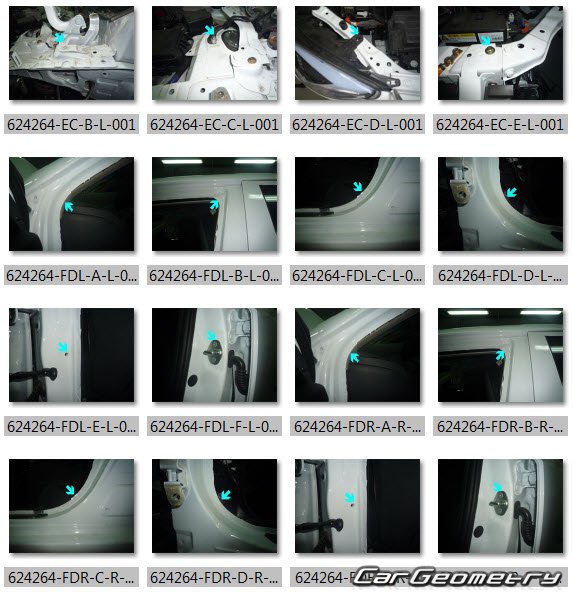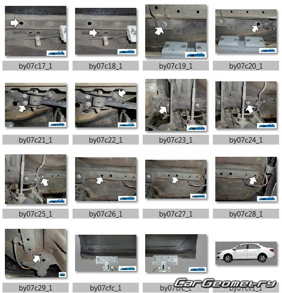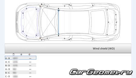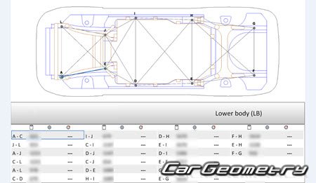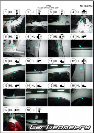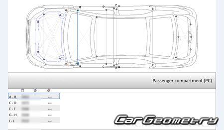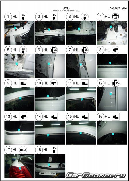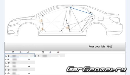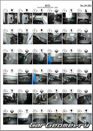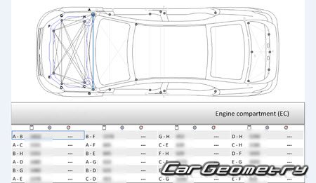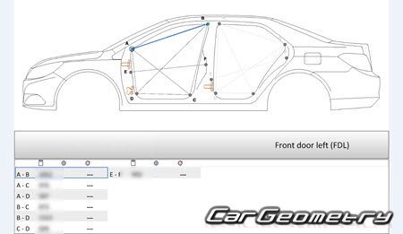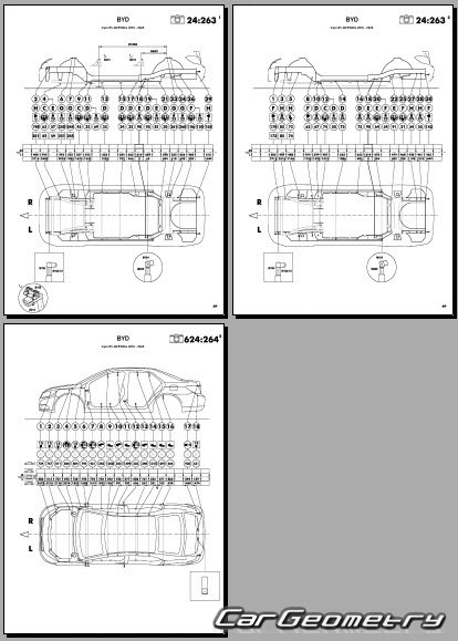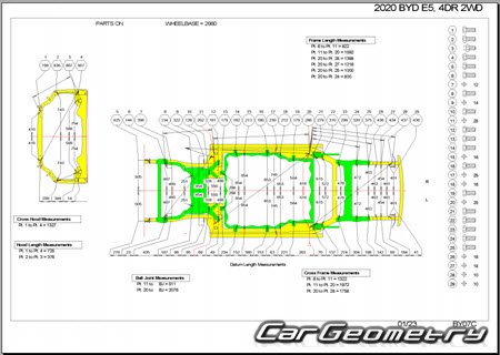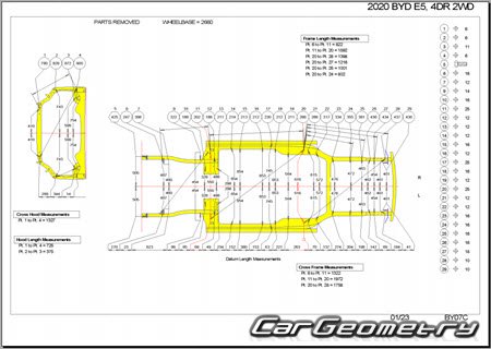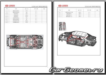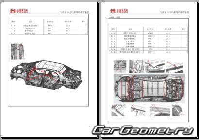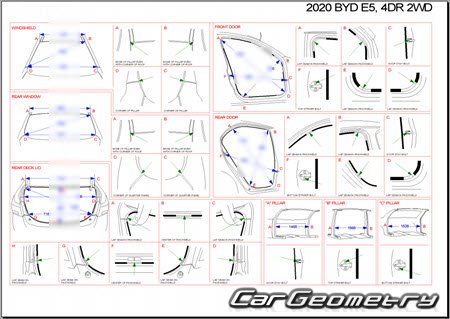 Body dimensions for restoring the body geometry of BYD E5 2016–2020. With the help of this information, you can check the geometry of the damaged body, as well as carry out restoration work on the straightening of cars.