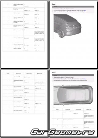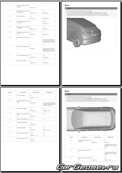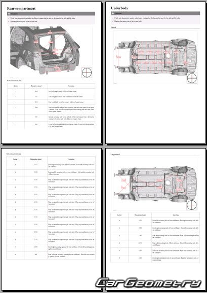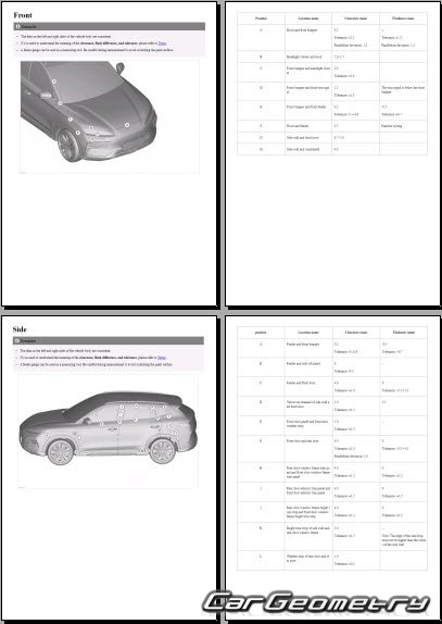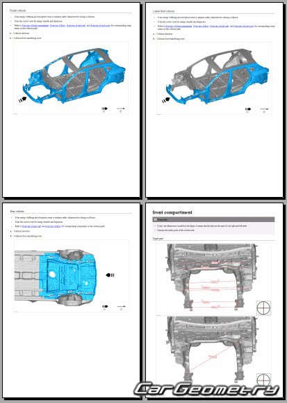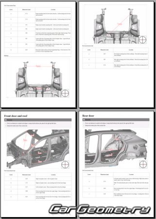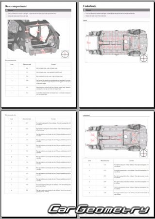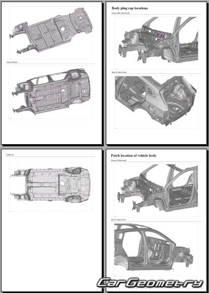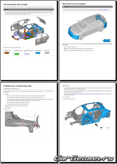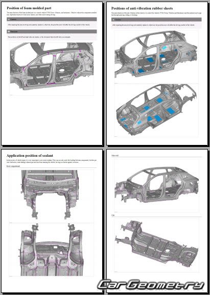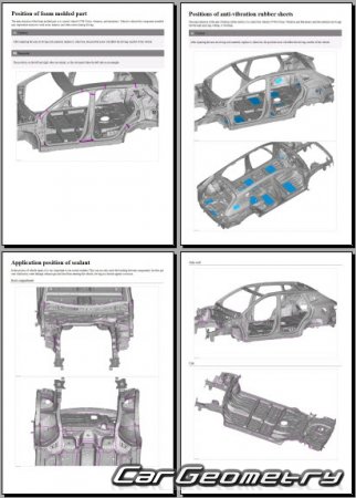 The information included in the manual consists of body dimensions, control points, sectional images of body elements, applicable materials, recommendations for welding types, methods, and materials, locations and materials for applying seals, sound insulation, and anti-corrosion sealants, areas and directions for cutting body elements for subsequent installation of new parts, interior material types, and decoding of markings.