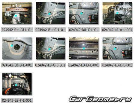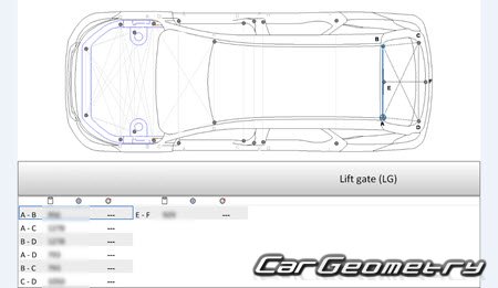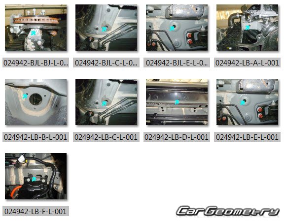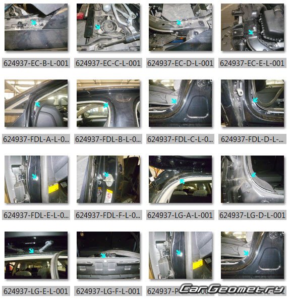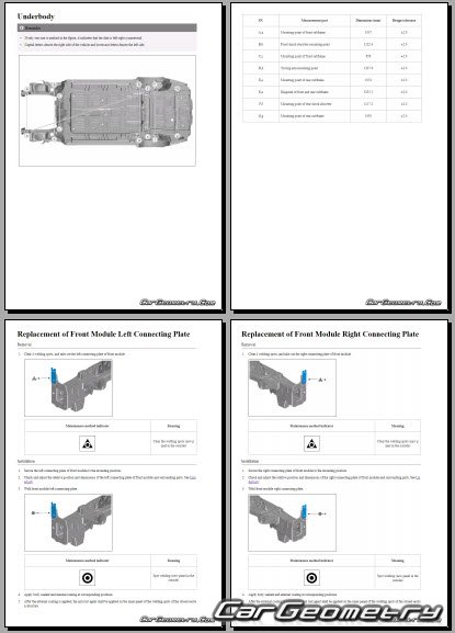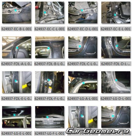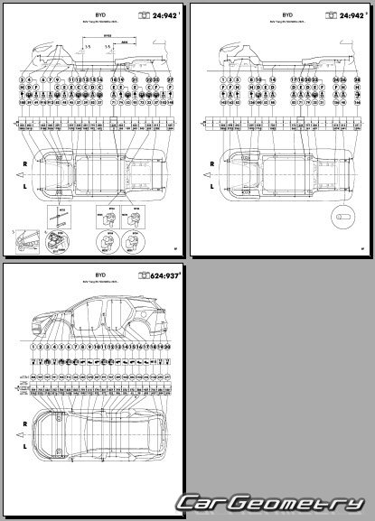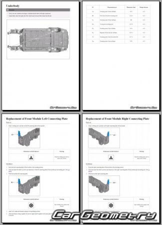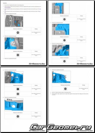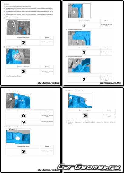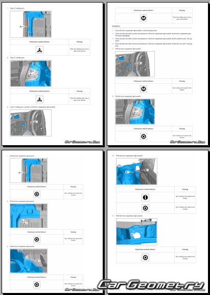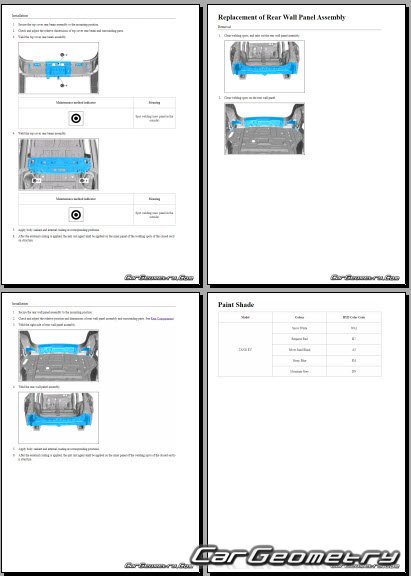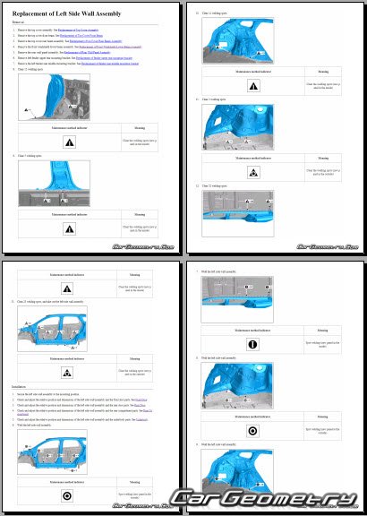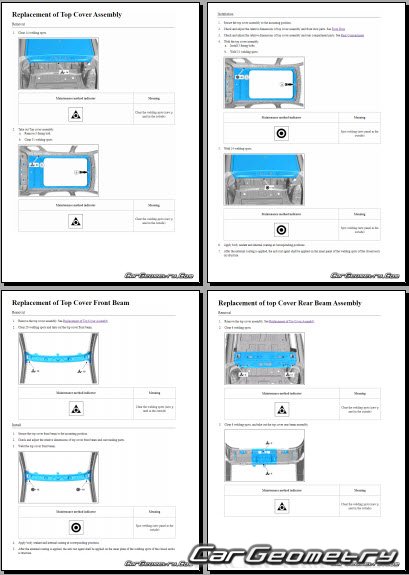 The information included in the manual consists of body dimensions, control points, sectional images of body elements, applicable materials, recommendations for welding types, methods, and materials, locations and materials for applying seals, sound insulation, and anti-corrosion sealants, areas and directions for cutting body elements for subsequent installation of new parts, interior material types, and decoding of markings.