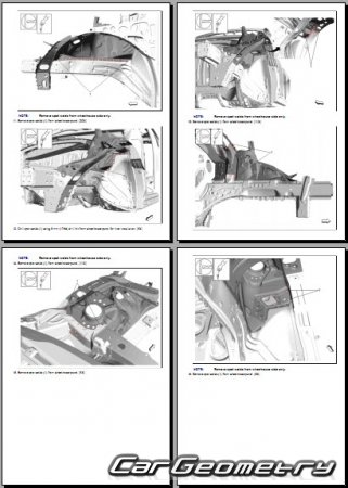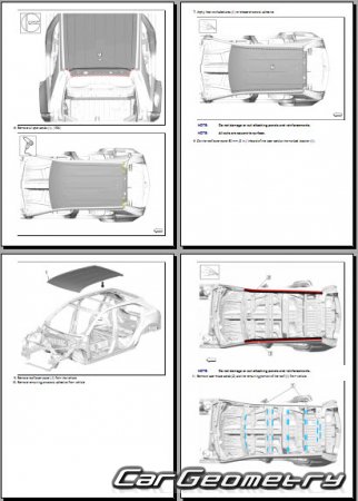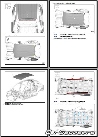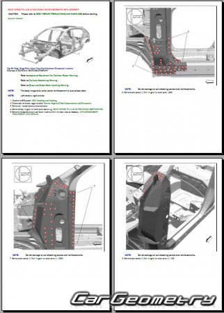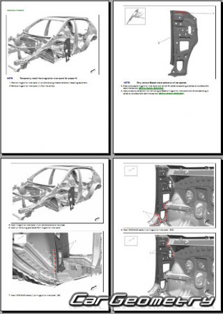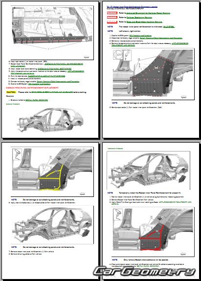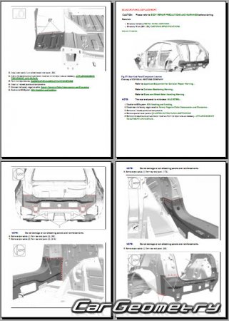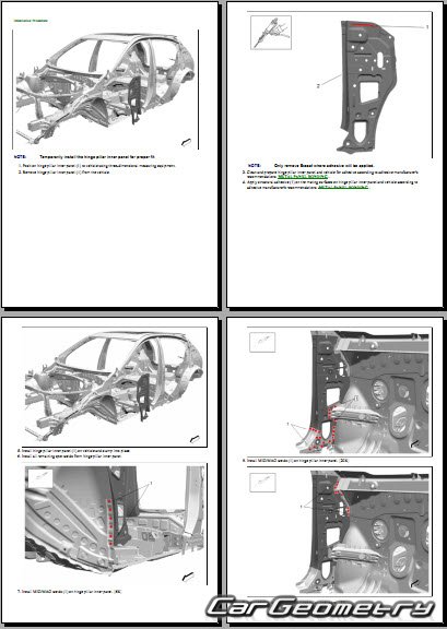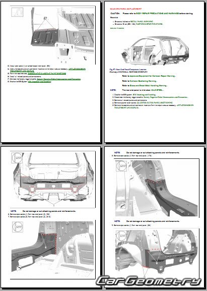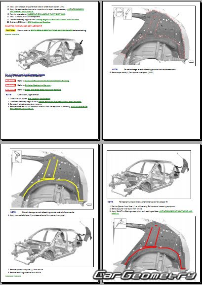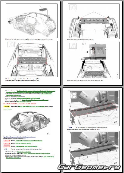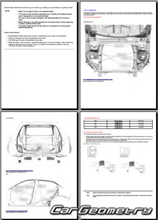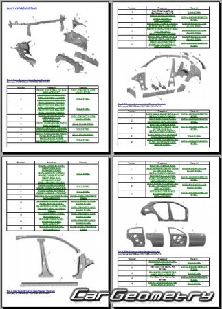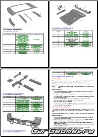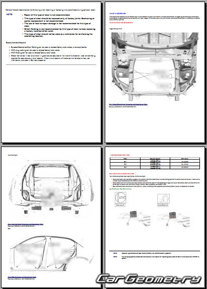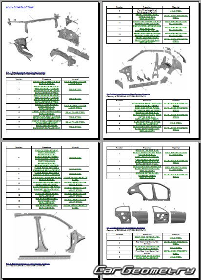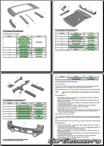 Information for the Cadillac XT4 body geometric dimensions, control points, images of body elements, materials used, recommendations on applicable types, methods and materials for the welding points; places and materials for applying seam, soundproof and anti-corrosion sealants; points and directions for pre-cuts of body parts for the future installation of the new ones; types of interior materials, definitions and decoding.