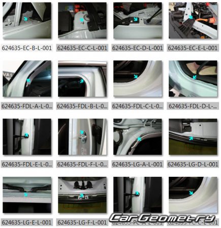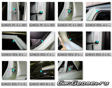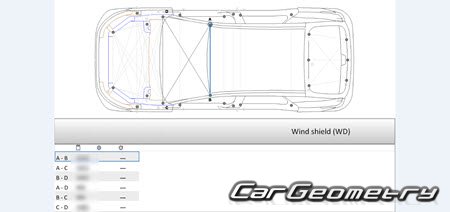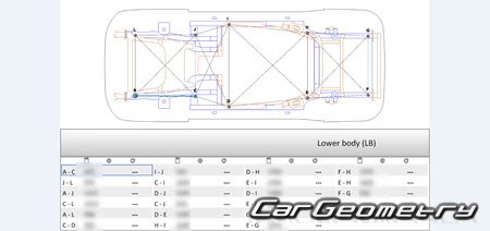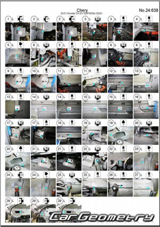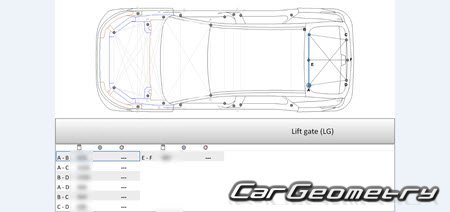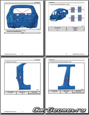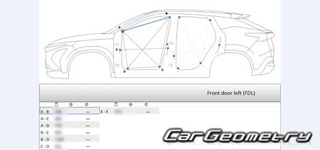 Information for the Omoda C5 body geometric dimensions, control points, images of body elements, materials used, recommendations on applicable types, methods and materials for the welding points; places and materials for applying seam, soundproof and anti-corrosion sealants; points and directions for pre-cuts of body parts for the future installation of the new ones; types of interior materials, definitions and decoding.