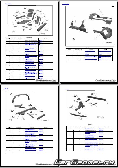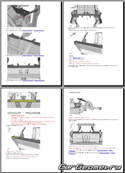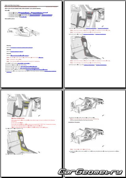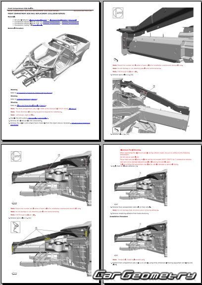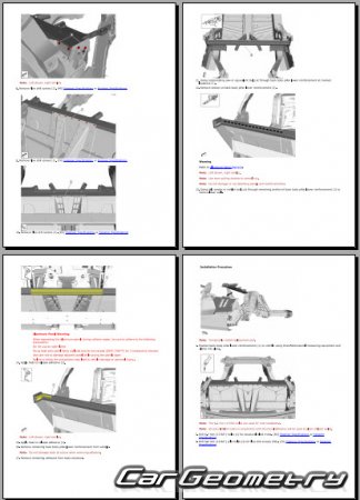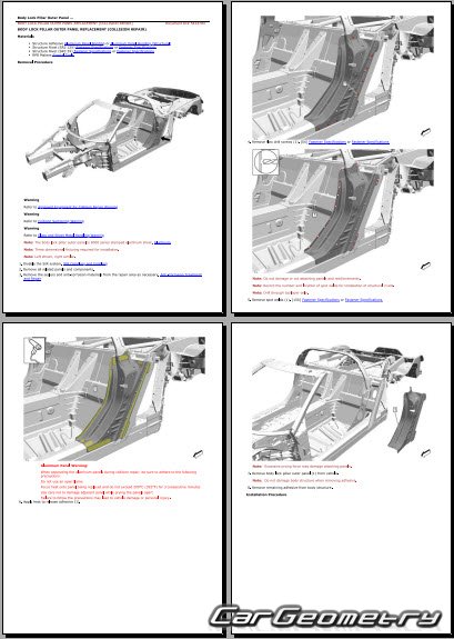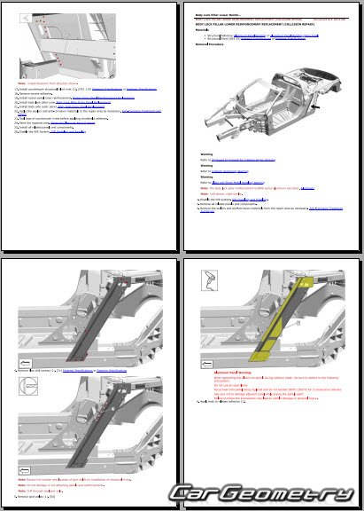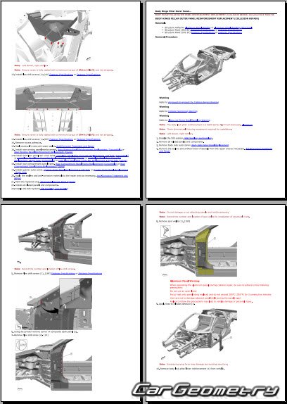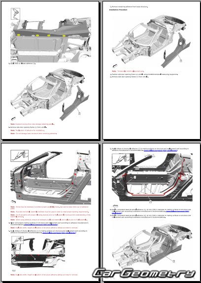 The manual features diagrams and illustrations that depict cross-sections of body elements, aiding in visualizing the structural composition and facilitating the repair process. It also covers cutting procedures and directions for removing and installing new body components, ensuring accurate and efficient repairs.