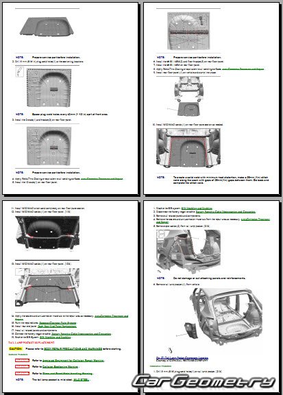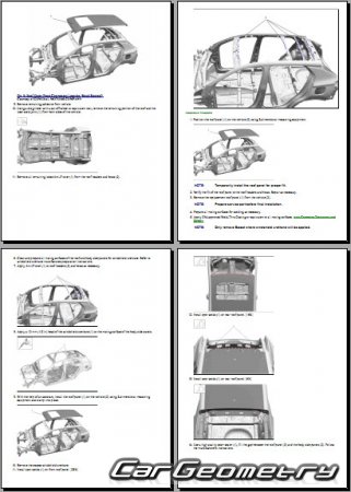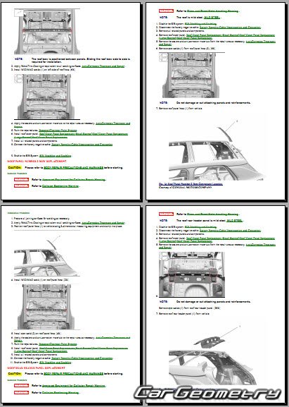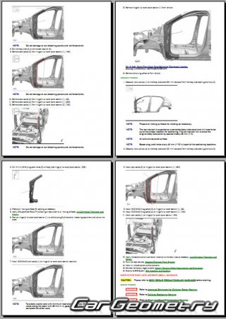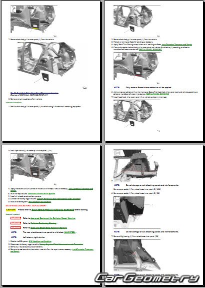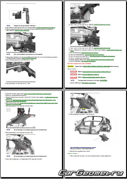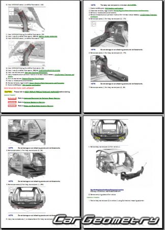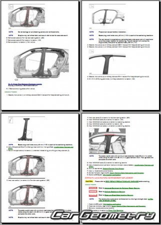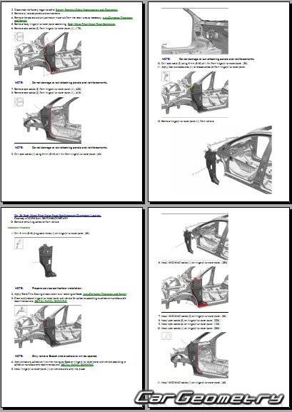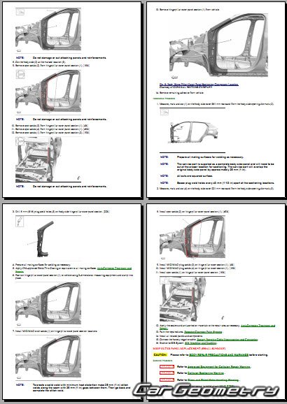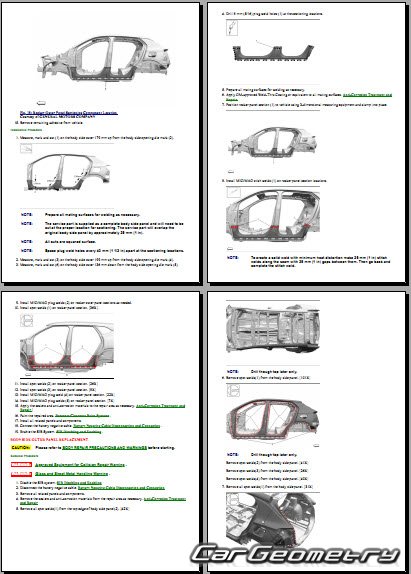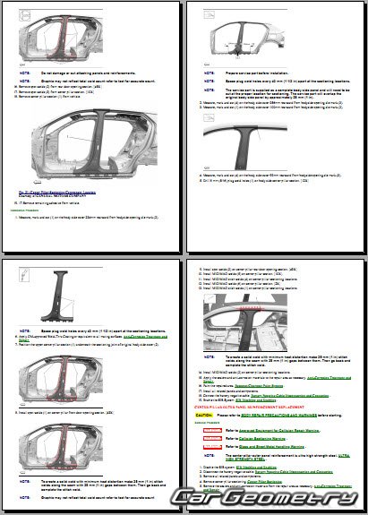 The manual features diagrams and illustrations that depict cross-sections of body elements, aiding in visualizing the structural composition and facilitating the repair process. It also covers cutting procedures and directions for removing and installing new body components, ensuring accurate and efficient repairs.