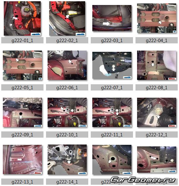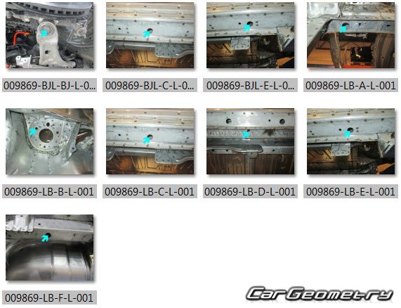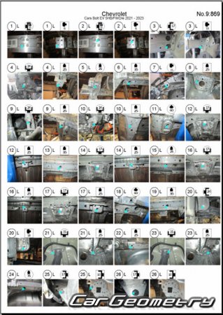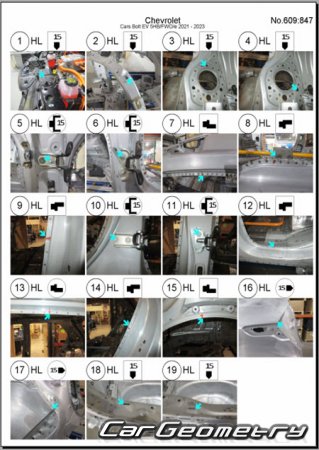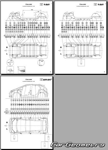 Body dimensions for restoring the body geometry of Chevrolet Bolt EV 2021–2023. With the help of this information, you can check the geometry of the damaged body, as well as carry out restoration work on the straightening of cars.