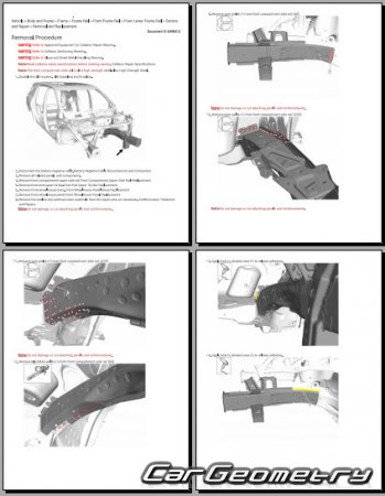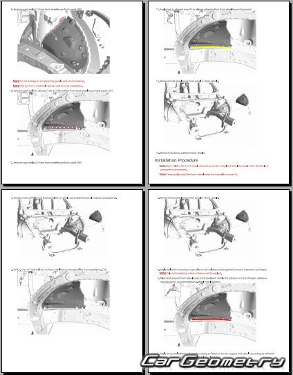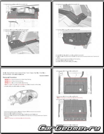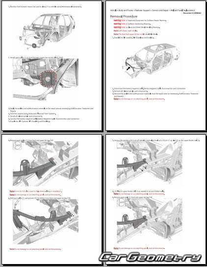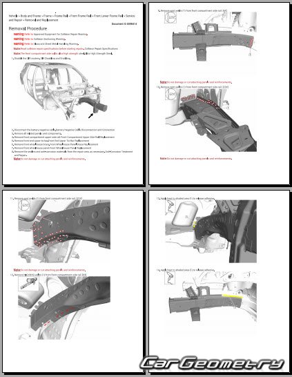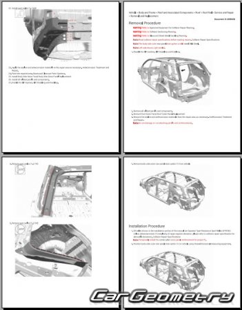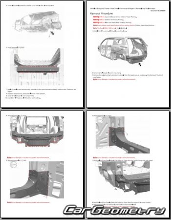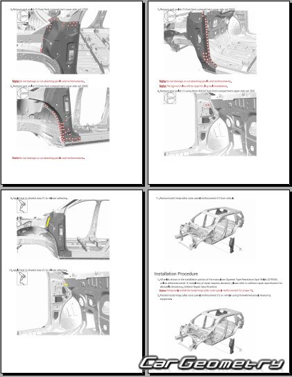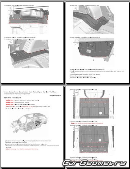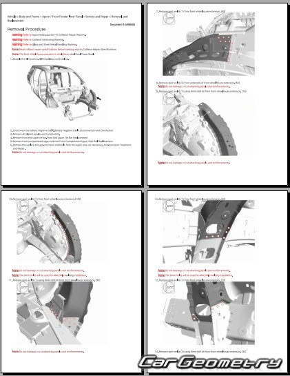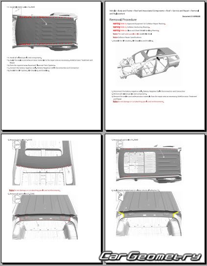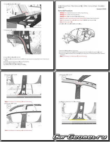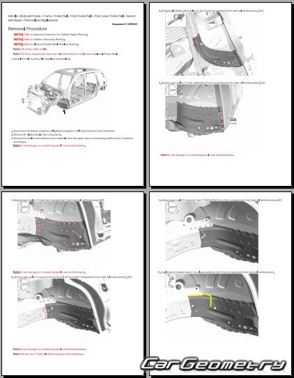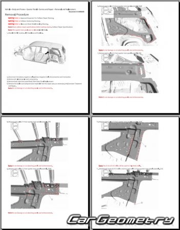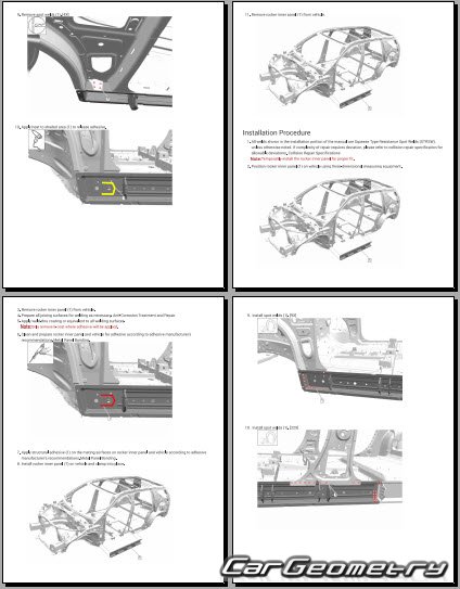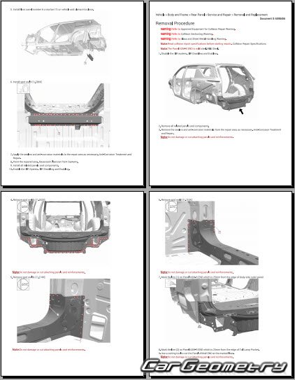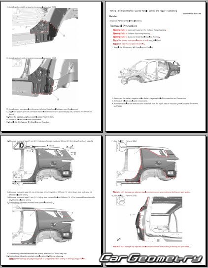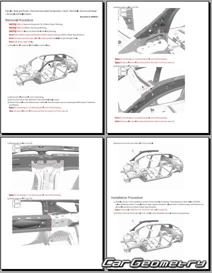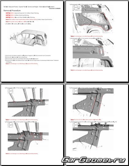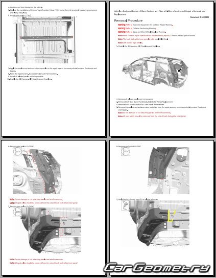 The manual features diagrams and illustrations that depict cross-sections of body elements, aiding in visualizing the structural composition and facilitating the repair process. It also covers cutting procedures and directions for removing and installing new body components, ensuring accurate and efficient repairs.