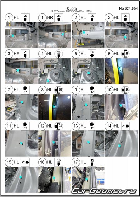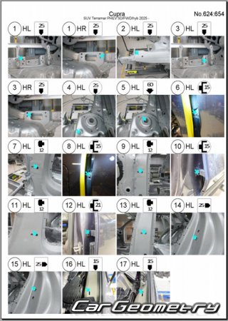 The factory body repair manual contains body dimensions for the Cupra Terramar (KP1) 2025-2030 and includes description of various body parts replacement, body dimension, control points for the Cupra Terramar.