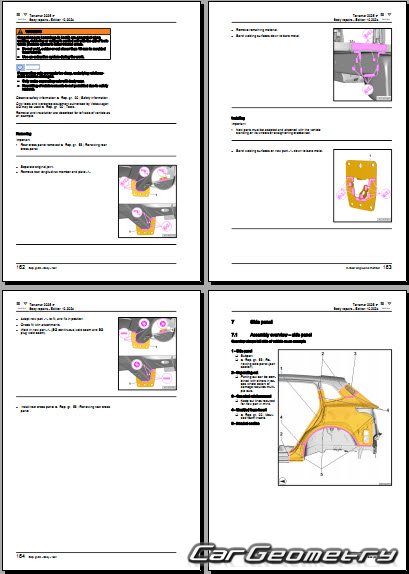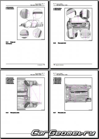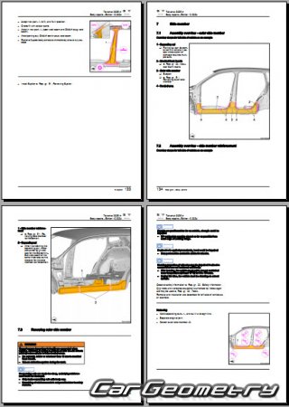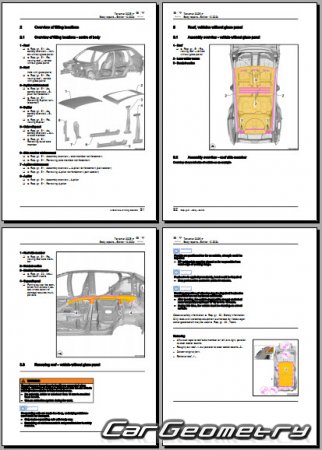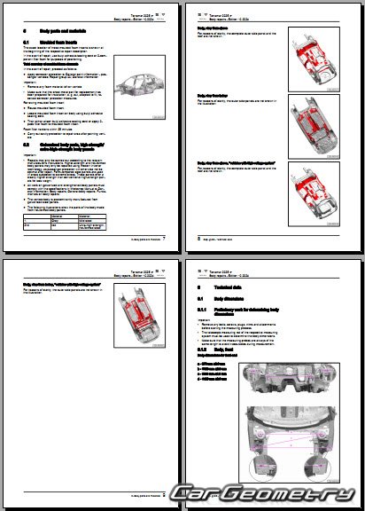 Information for the Cupra Terramar body geometric dimensions, control points, images of body elements, materials used, recommendations on applicable types, methods and materials for the welding points; places and materials for applying seam, soundproof and anti-corrosion sealants; points and directions for pre-cuts of body parts for the future installation of the new ones; types of interior materials, definitions and decoding.