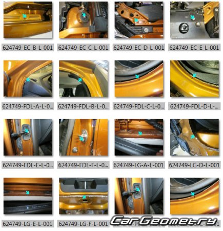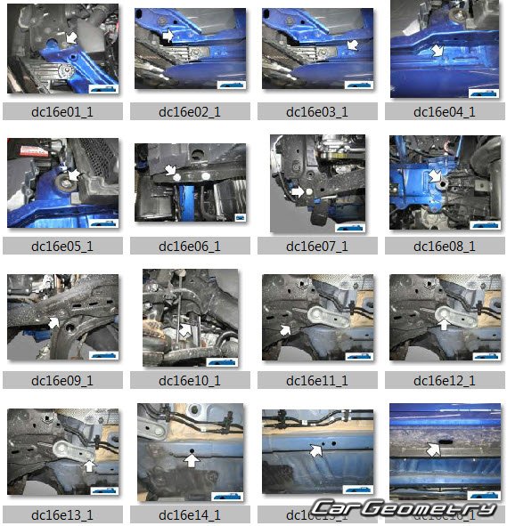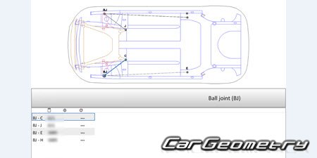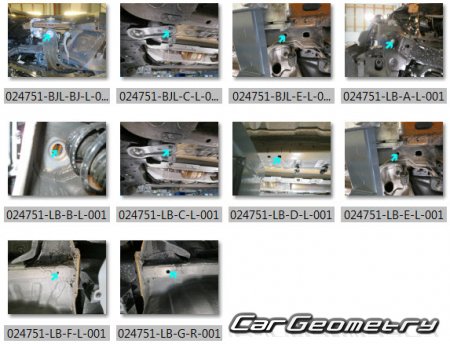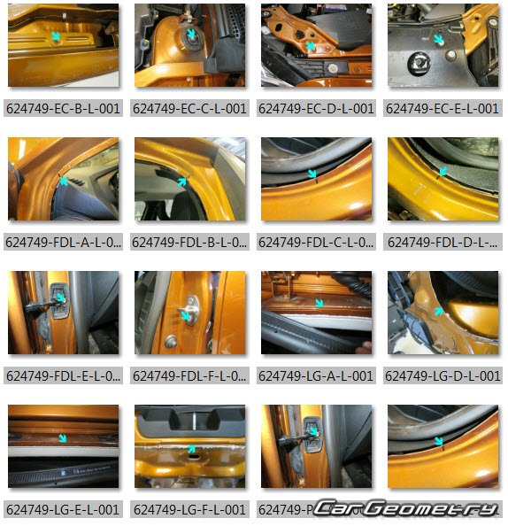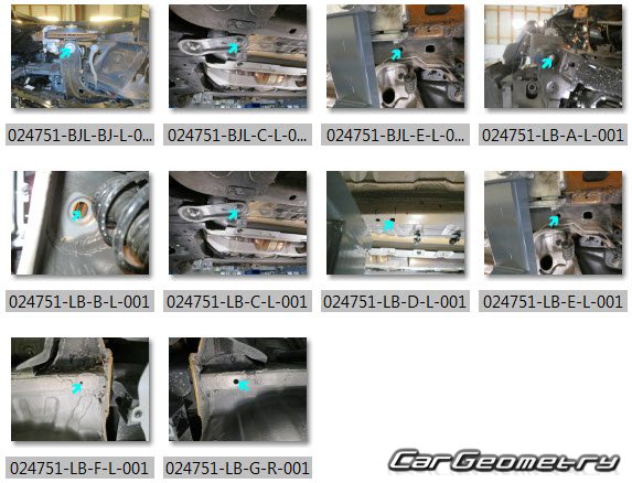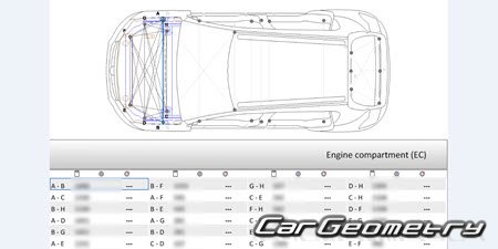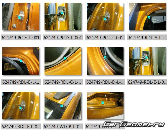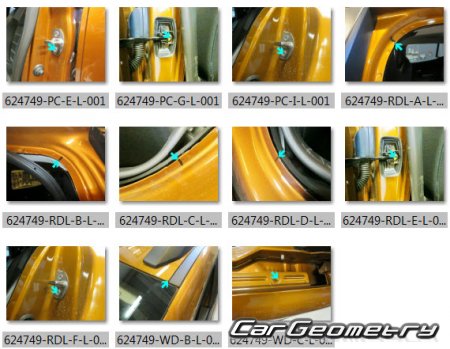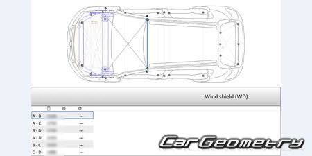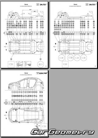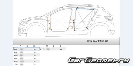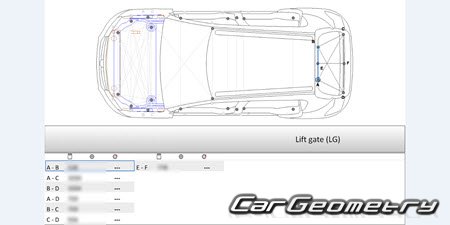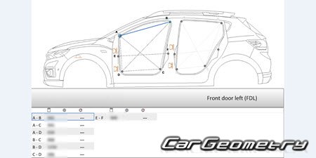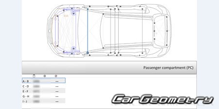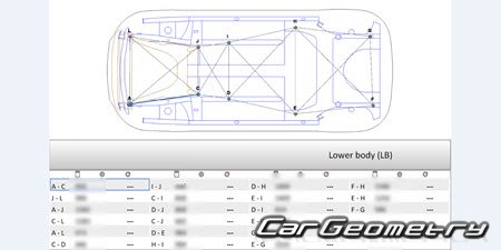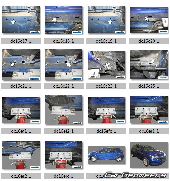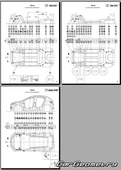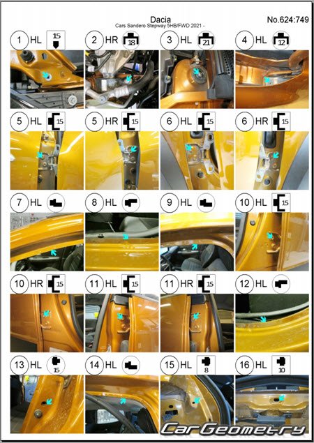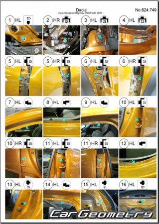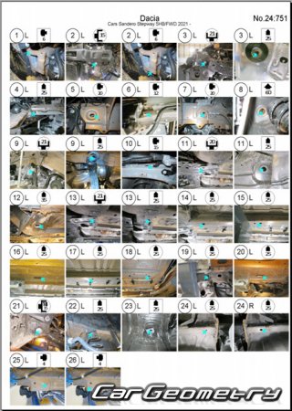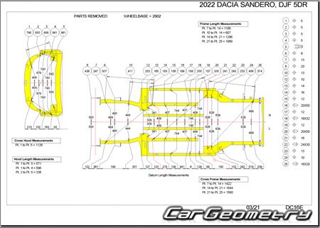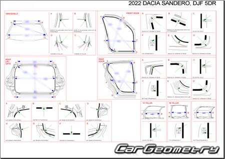 Body dimensions for restoring the body geometry of Dacia Sandero Stepway 2021-2028. With the help of this information, you can check the geometry of the damaged body, as well as carry out restoration work on the straightening of cars.