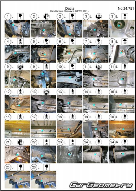 Selection from factory documentation and vehicle measurement database for Renault Sandero Stepway 2021-2028: body dimensions and geometry measurement points (chassis diagrams, upper body datasheet, underbody datasheet).
