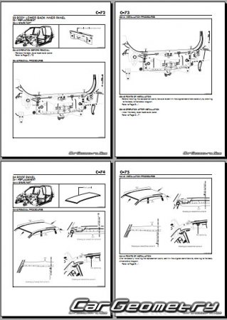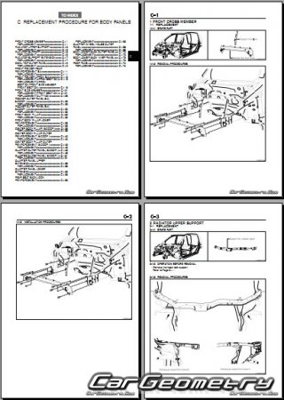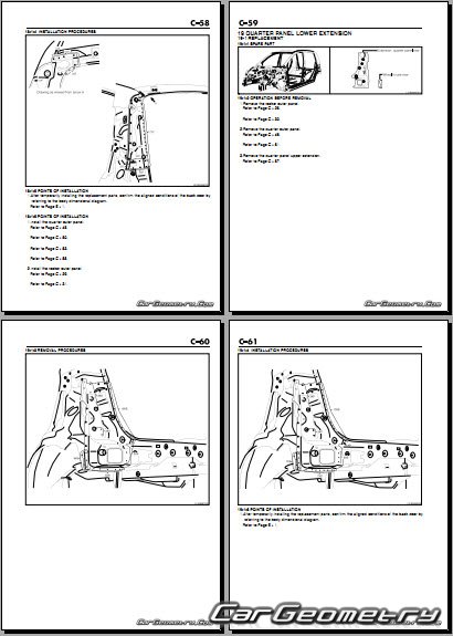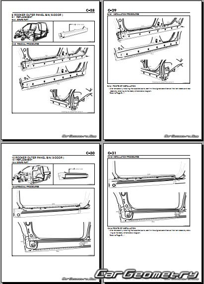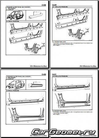 The manual features diagrams and illustrations that depict cross-sections of body elements, aiding in visualizing the structural composition and facilitating the repair process. It also covers cutting procedures and directions for removing and installing new body components, ensuring accurate and efficient repairs.