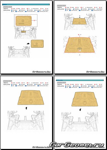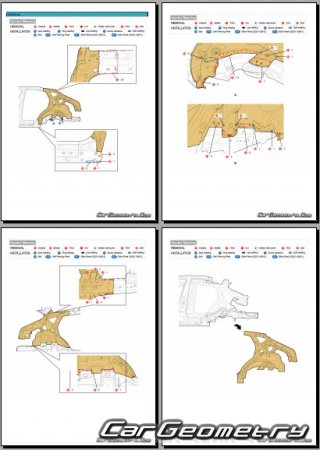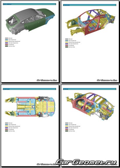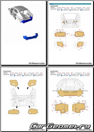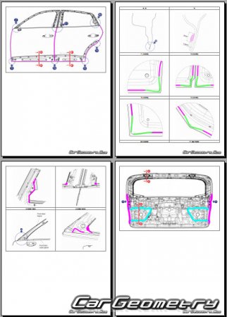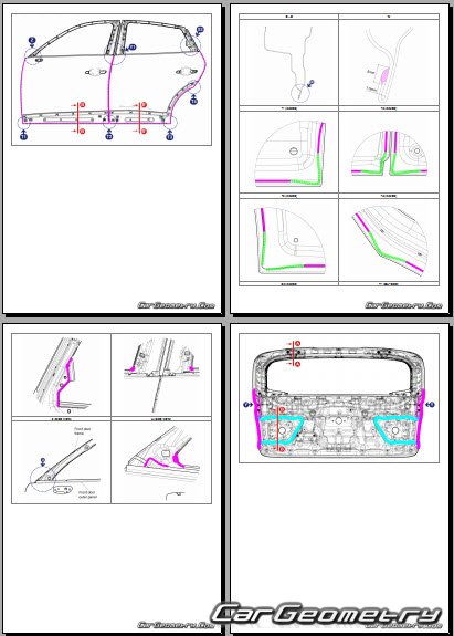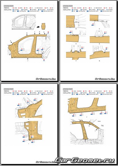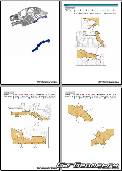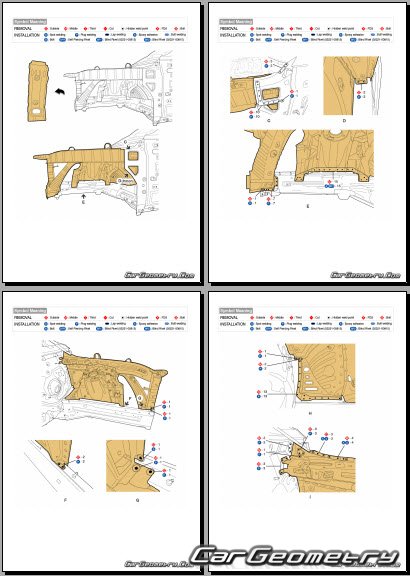 Information for the Genesis GV80 Coupe body geometric dimensions, control points, images of body elements, materials used, recommendations on applicable types, methods and materials for the welding points; places and materials for applying seam, soundproof and anti-corrosion sealants; points and directions for pre-cuts of body parts for the future installation of the new ones; types of interior materials, definitions and decoding.