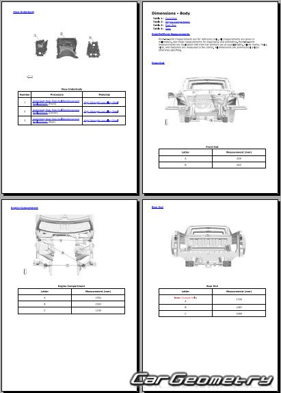 One of the key features of the manual is its coverage of body dimensions and control points. These dimensions provide precise measurements of the vehicle's body components, allowing technicians to accurately assess any deviations from the original specifications. The control points serve as reference points for checking the alignment and geometry of the vehicle's body, ensuring that repairs are carried out with precision.