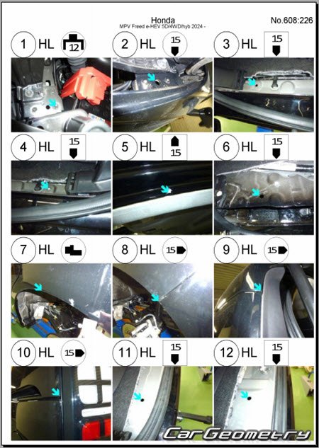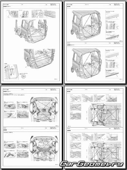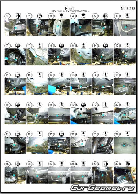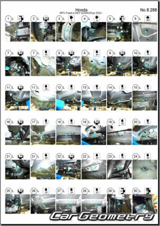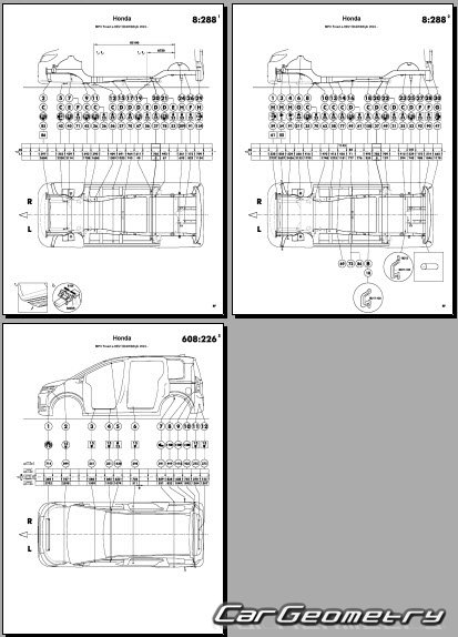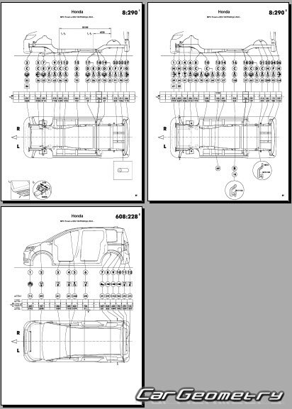Body dimensions for restoring the body geometry of Honda Freed e:Hev (GT5 GT6 GT7 GT8) from 2024 are used to verify the body geometry and facilitate the subsequent repair of damaged parts. These measurements are specifically applicable to the right-hand drive versions of Honda Freed e:Hev for the Japanese market.