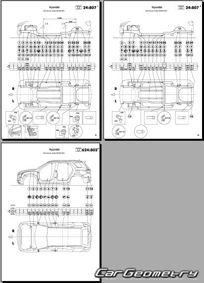 The factory manual contains the geometric dimensions of the Hyundai Alcazar (PS7) and Hyundai Creta Grand (SU2) 2024-2028 body and includes a description of the replacement of various body elements and body dimensions, control points of the Hyundai Alcazar body geometry for the Indian market and Hyundai Creta Grand for the Mexican market.