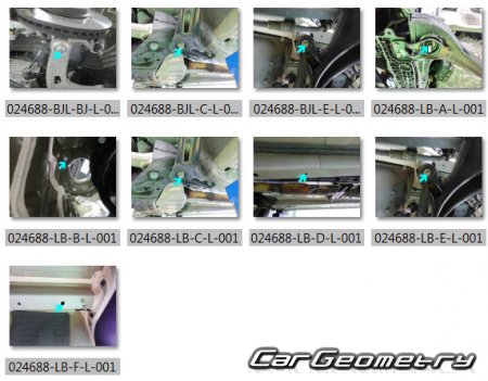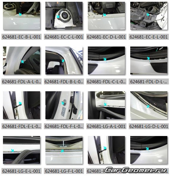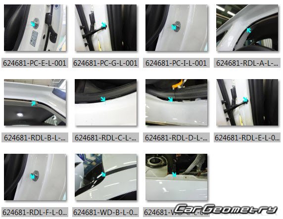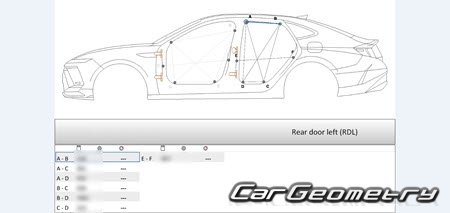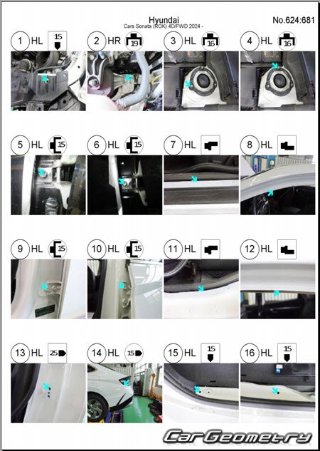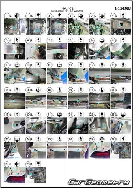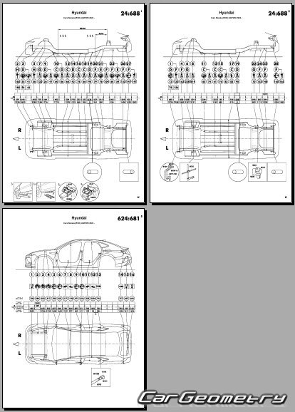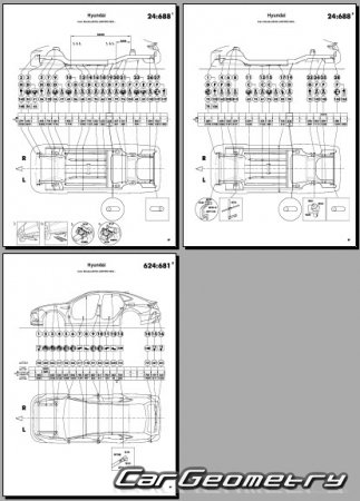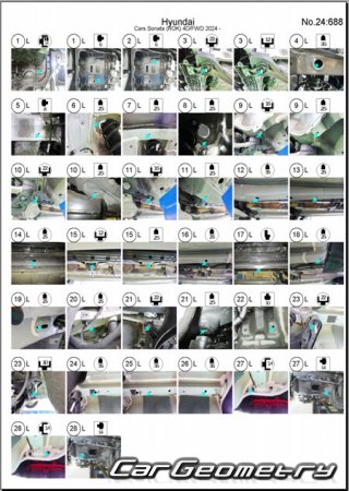 Information for the Hyundai Sonata (DN8) 2024-2026 body geometric dimensions, control points, images of body elements, materials used, recommendations on applicable types, methods and materials for the welding points; places and materials for applying seam, soundproof and anti-corrosion sealants; points and directions for pre-cuts of body parts for the future installation of the new ones; types of interior materials, definitions and decoding.