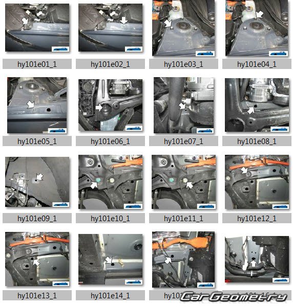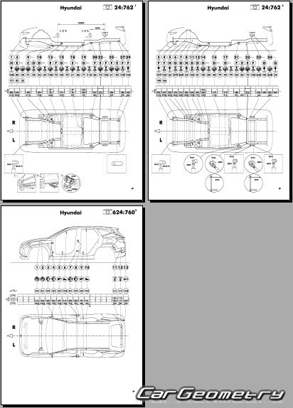 The factory body repair manual contains body dimensions for the Hyundai Tucson (NX4e) PHEV 2021-2027 and includes description of various body parts replacement, body dimension, control points for the Hyundai Tucson PHEV (short base SWB 2,680 mm).