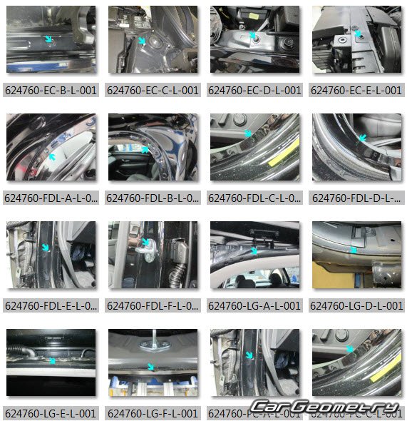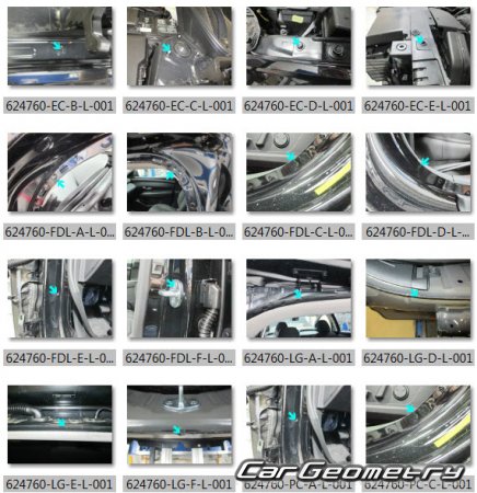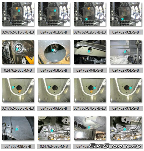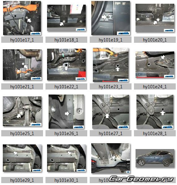 Information for the Hyundai Tucson (NX4e) PHEV 2021-2027 body geometric dimensions, control points, images of body elements, materials used, recommendations on applicable types, methods and materials for the welding points; places and materials for applying seam, soundproof and anti-corrosion sealants; points and directions for pre-cuts of body parts for the future installation of the new ones; types of interior materials, definitions and decoding.