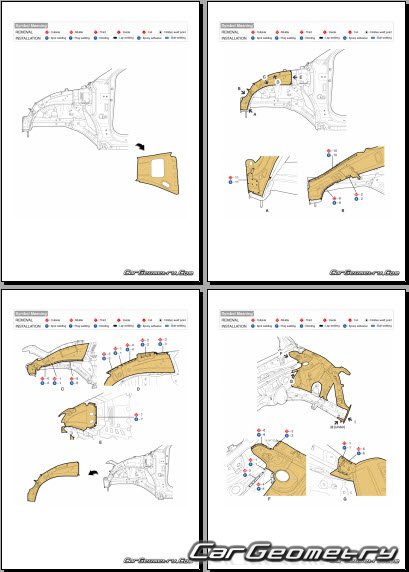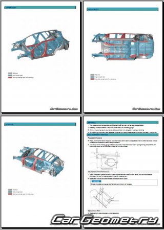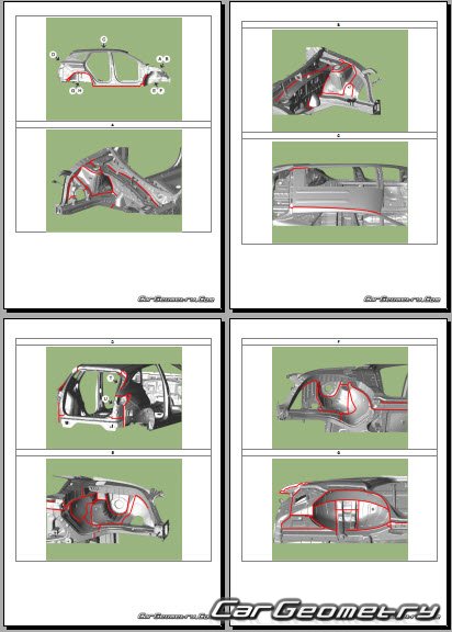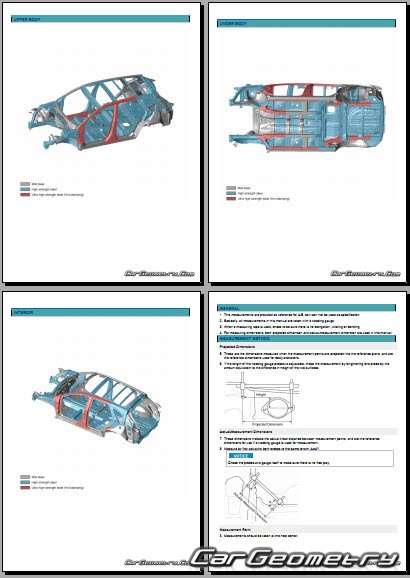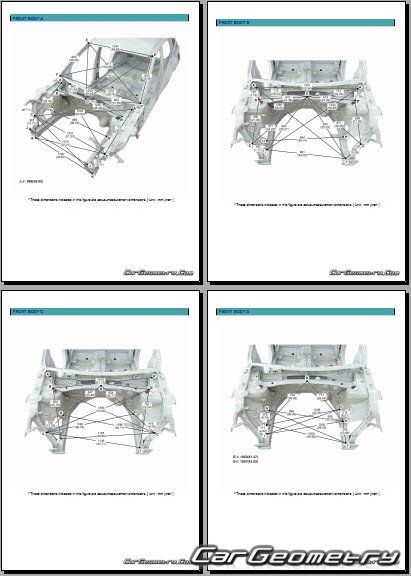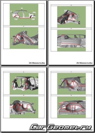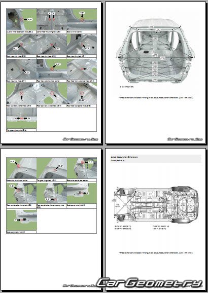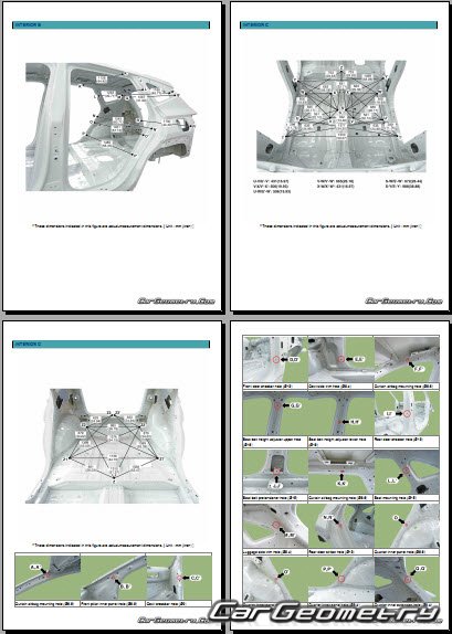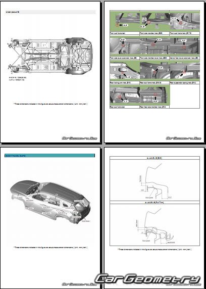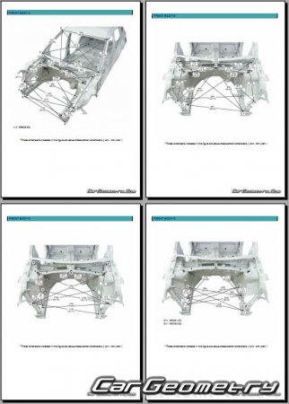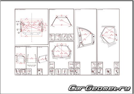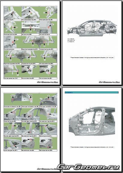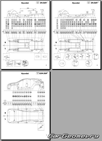 The factory body repair manual contains body dimensions for the Hyundai Tuscon (NX4) 2021-2027 and includes description of various body parts replacement, body dimension, control points for the Hyundai Tuscon (long base LWB 2,755 mm).