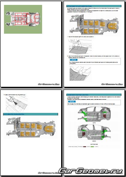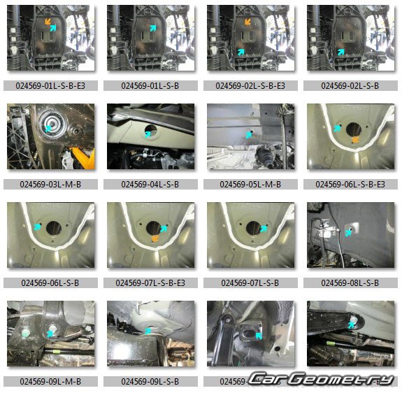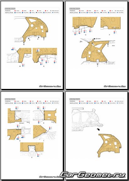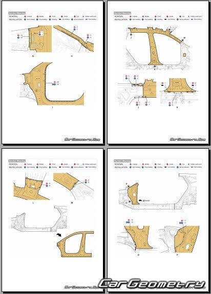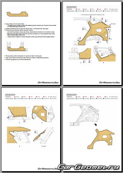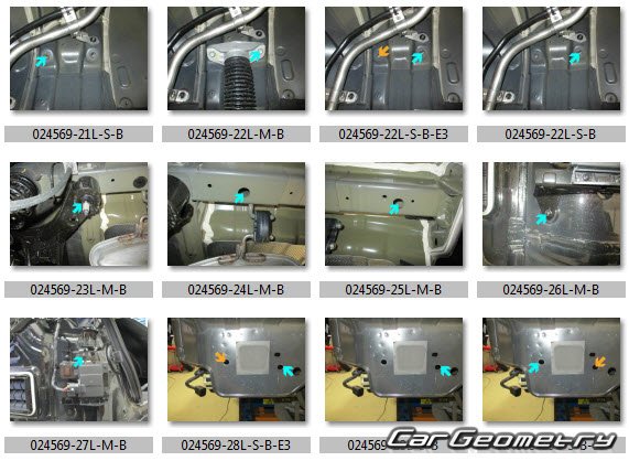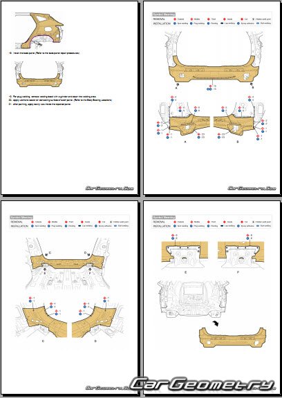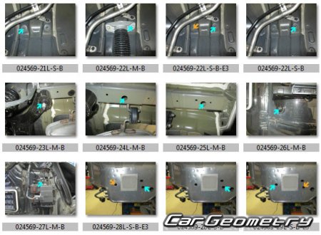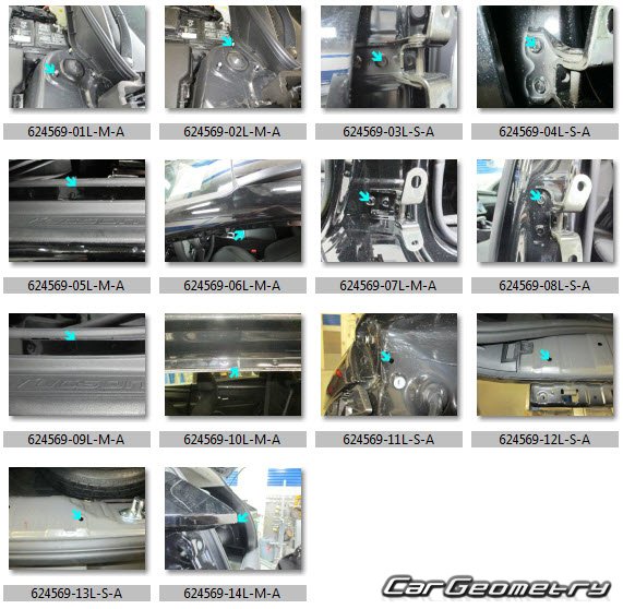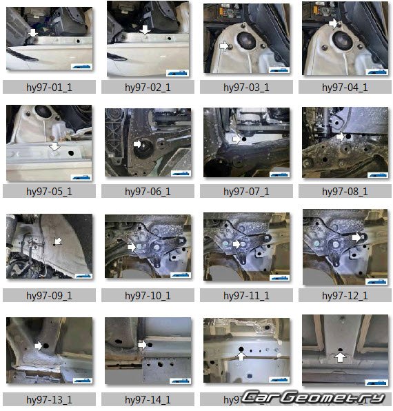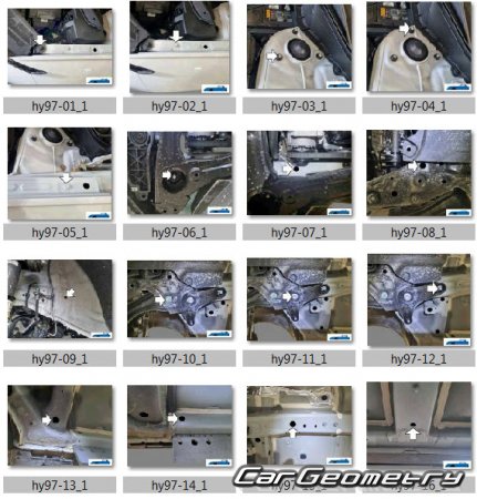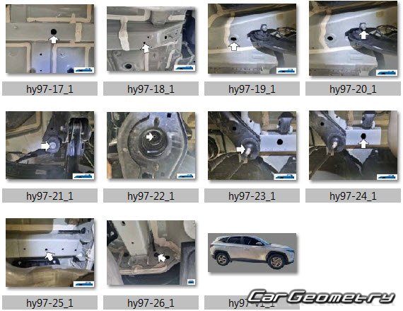 Information for the Hyundai Tuscon 2021-2027 body geometric dimensions, control points, images of body elements, materials used, recommendations on applicable types, methods and materials for the welding points; places and materials for applying seam, soundproof and anti-corrosion sealants; points and directions for pre-cuts of body parts for the future installation of the new ones; types of interior materials, definitions and decoding.