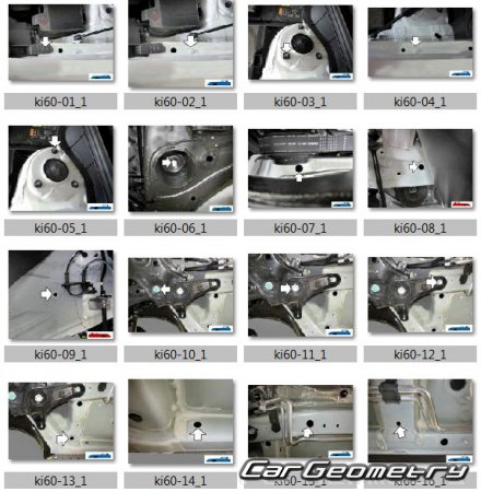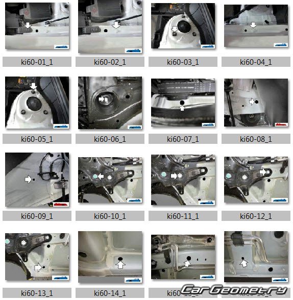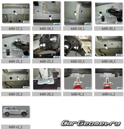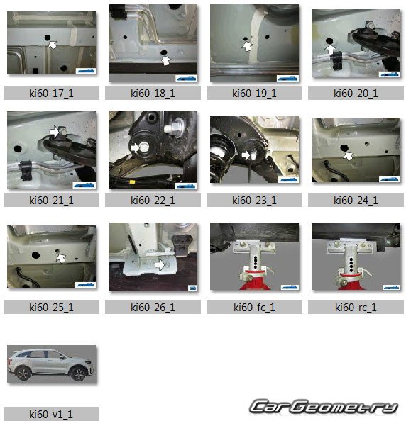 Information for the Kia Sorento 2021- body geometric dimensions, control points, images of body elements, materials used, recommendations on applicable types, methods and materials for the welding points; places and materials for applying seam, soundproof and anti-corrosion sealants; points and directions for pre-cuts of body parts for the future installation of the new ones; types of interior materials, definitions and decoding.