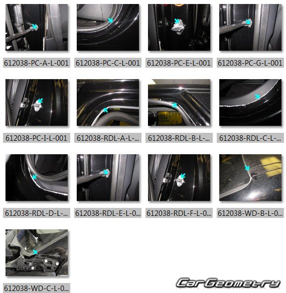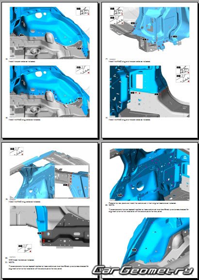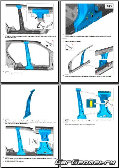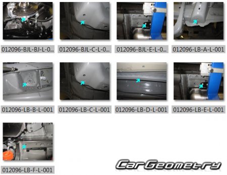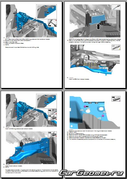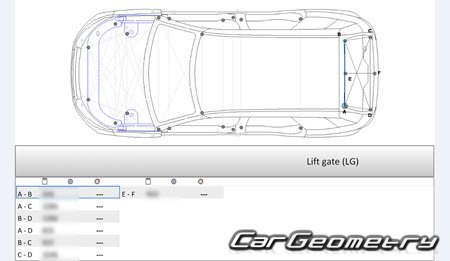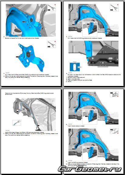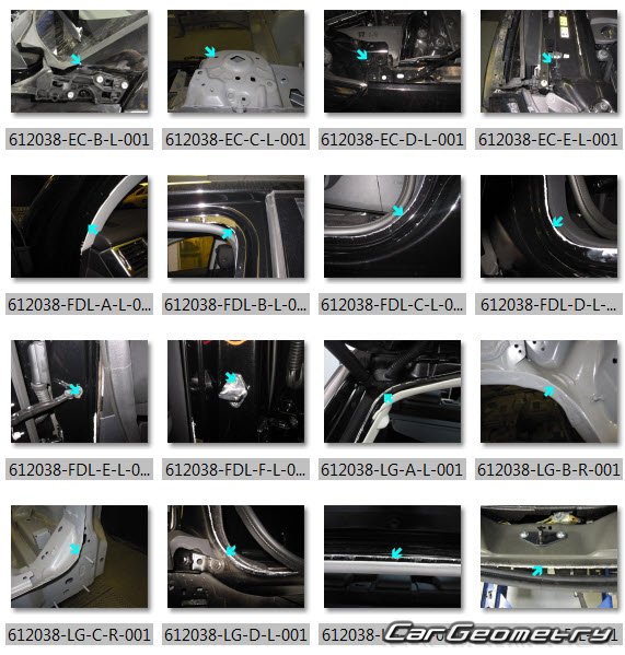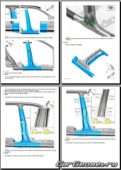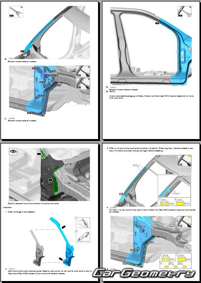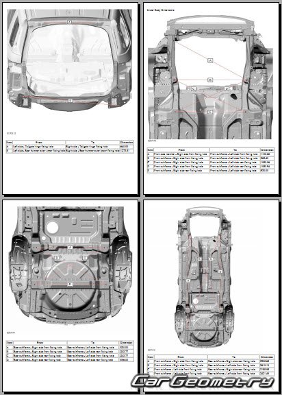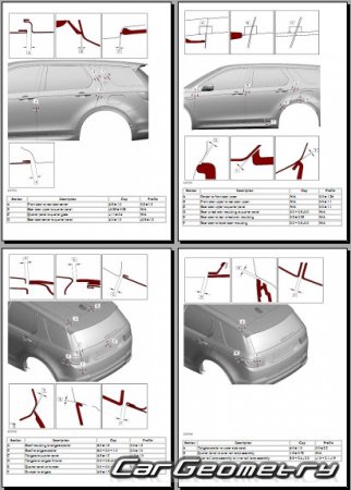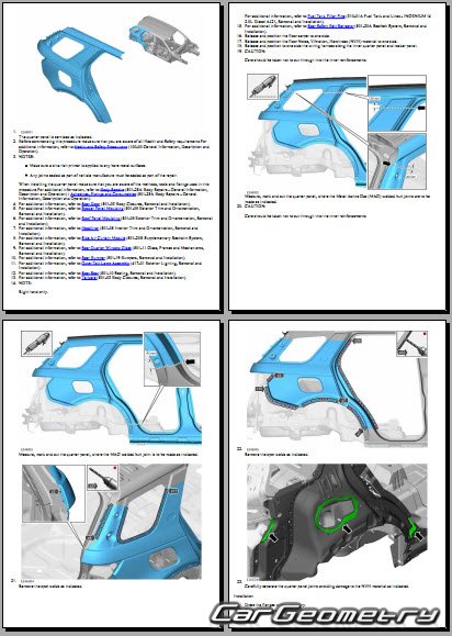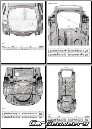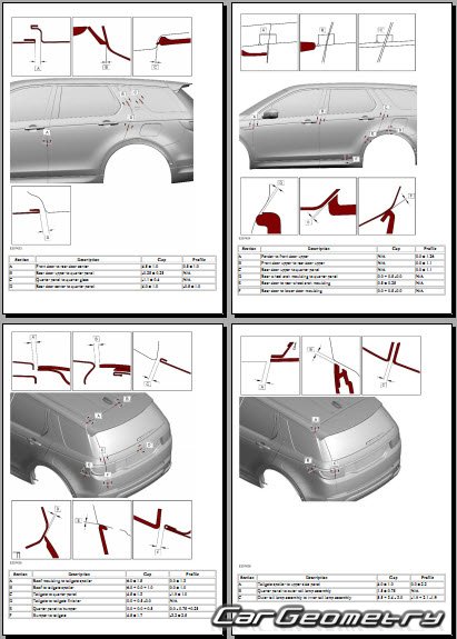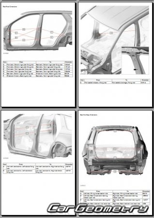 Information for the Land Rover Discovery Sport body geometric dimensions, control points, images of body elements, materials used, recommendations on applicable types, methods and materials for the welding points; places and materials for applying seam, soundproof and anti-corrosion sealants; points and directions for pre-cuts of body parts for the future installation of the new ones; types of interior materials, definitions and decoding.