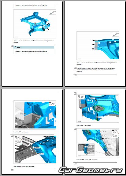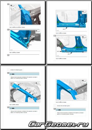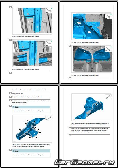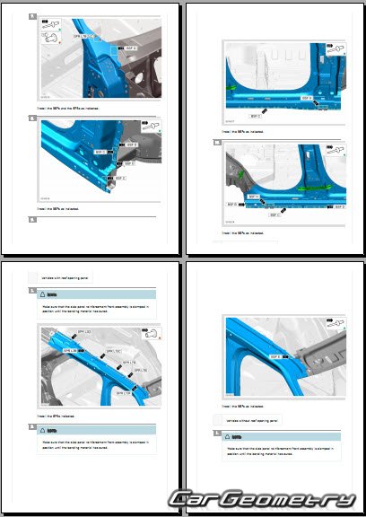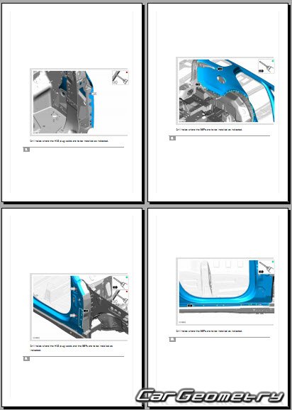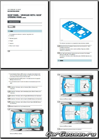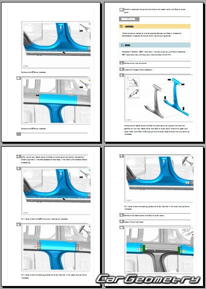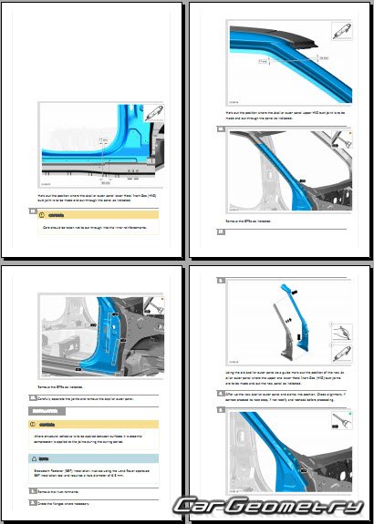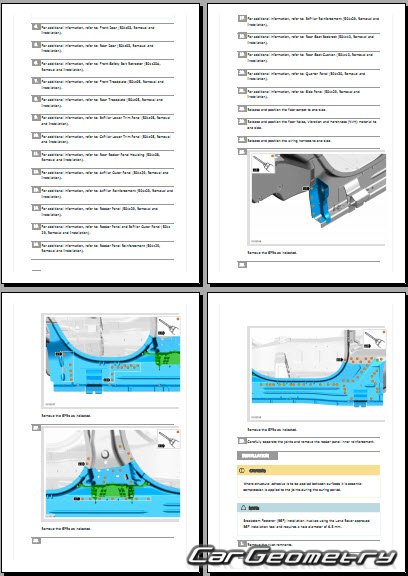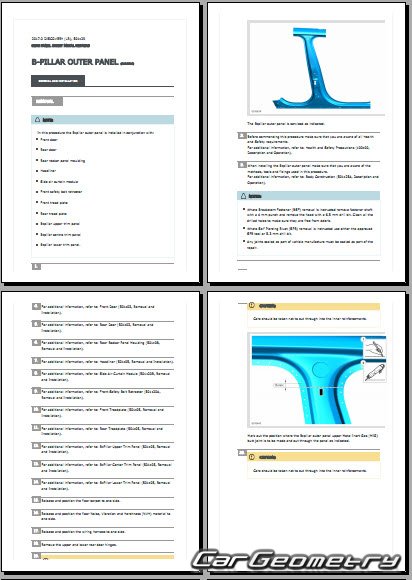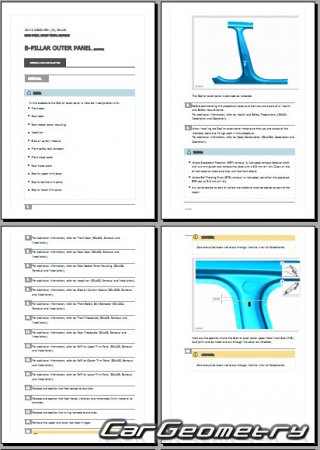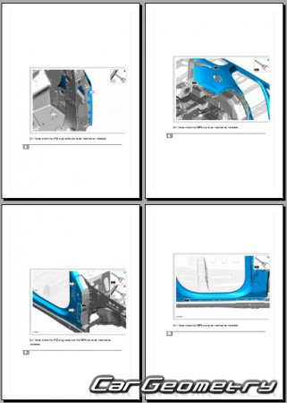 Information for the Land Rover Discovery 5 body geometric dimensions, control points, images of body elements, materials used, recommendations on applicable types, methods and materials for the welding points; places and materials for applying seam, soundproof and anti-corrosion sealants; points and directions for pre-cuts of body parts for the future installation of the new ones; types of interior materials, definitions and decoding.