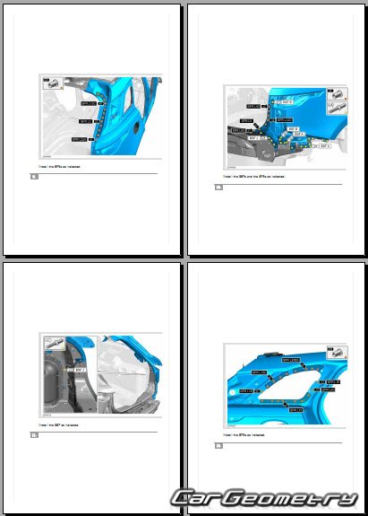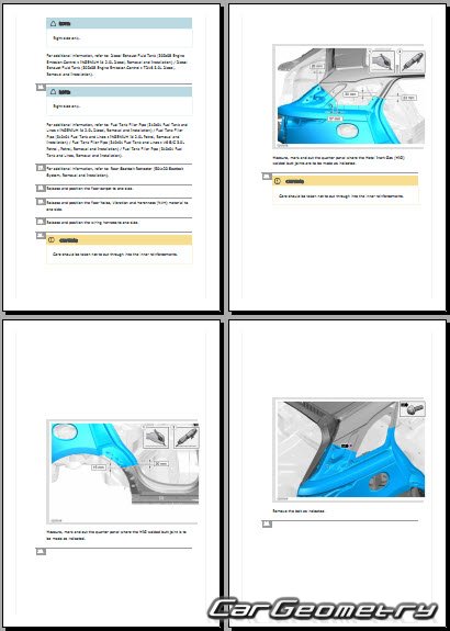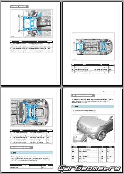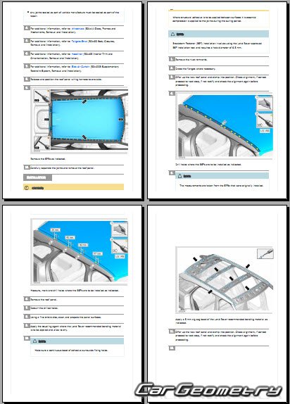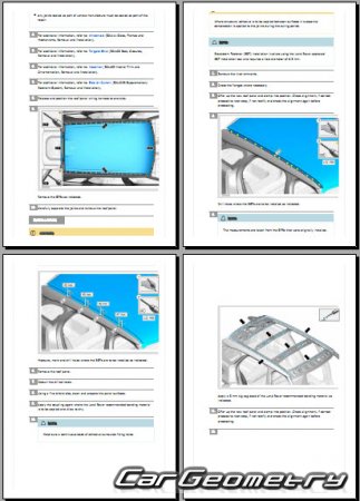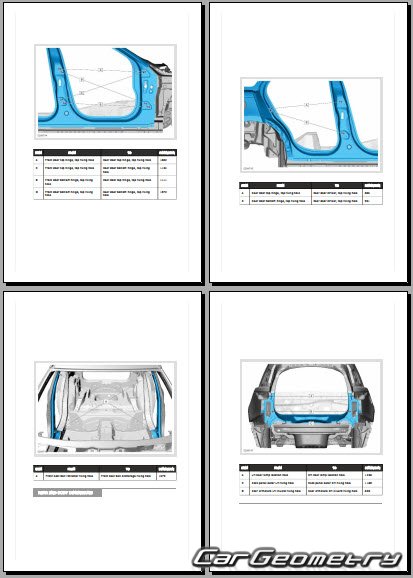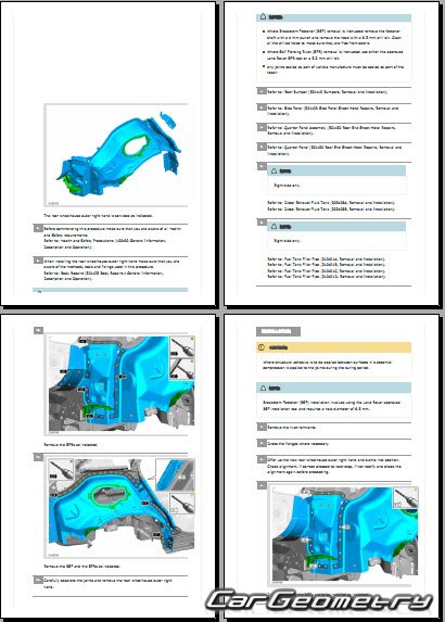 Information for the Range Rover Velar body geometric dimensions, control points, images of body elements, materials used, recommendations on applicable types, methods and materials for the welding points; places and materials for applying seam, soundproof and anti-corrosion sealants; points and directions for pre-cuts of body parts for the future installation of the new ones; types of interior materials, definitions and decoding.