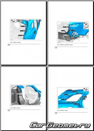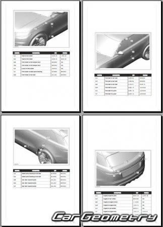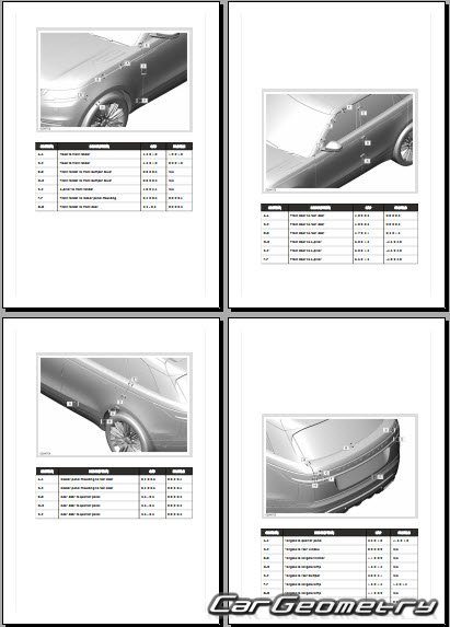 The factory body repair manual contains body dimensions for the Range Rover Velar (L560) 2017-2024 and includes description of various body parts replacement, body dimension, control points for the Range Rover Velar.
