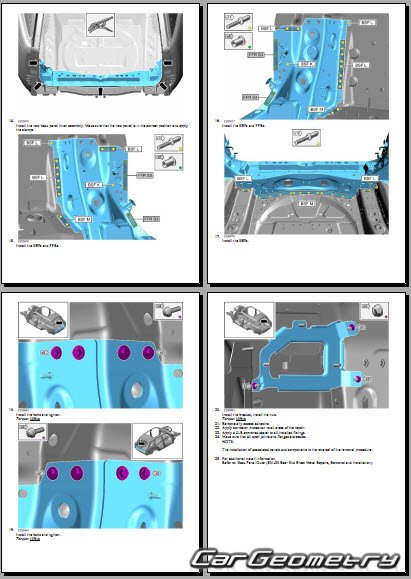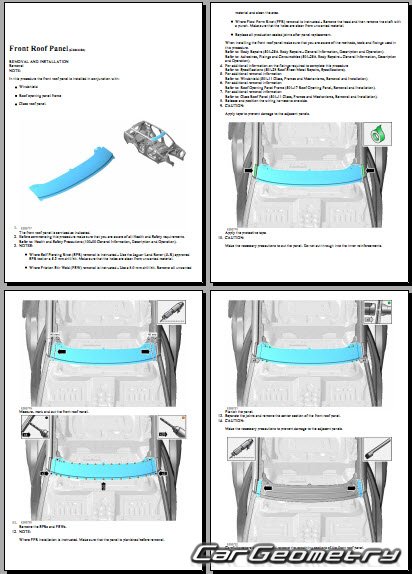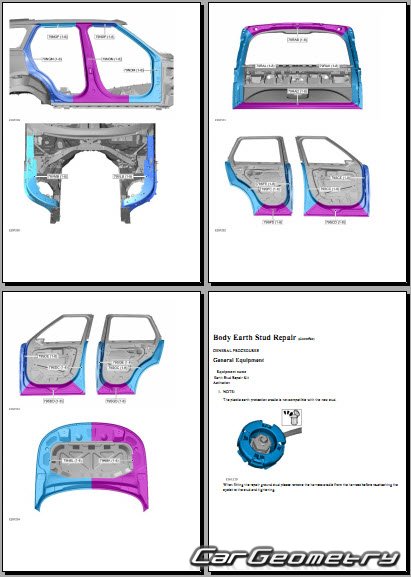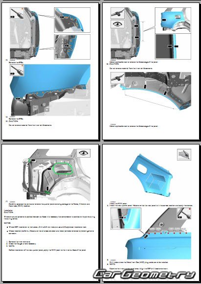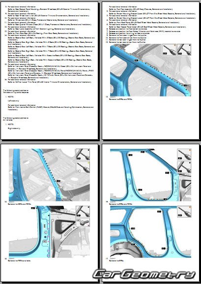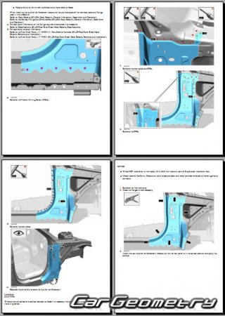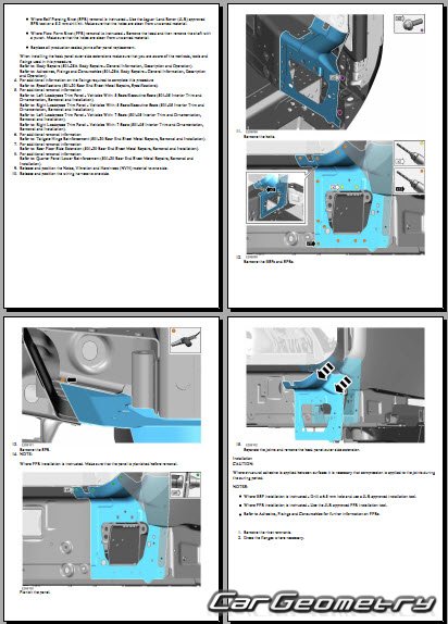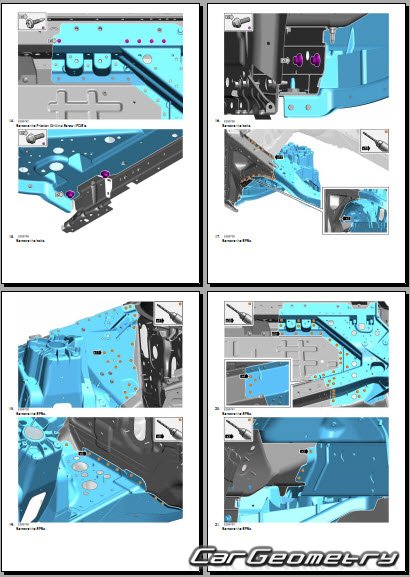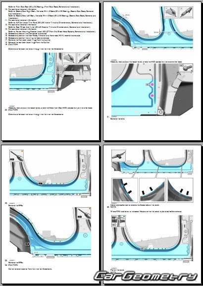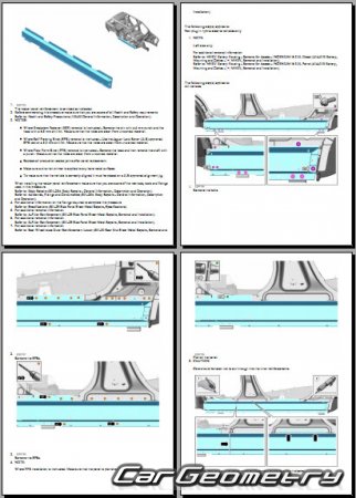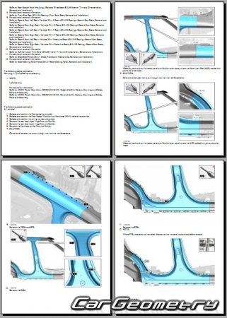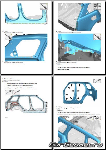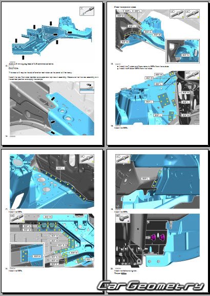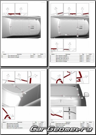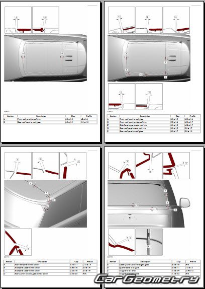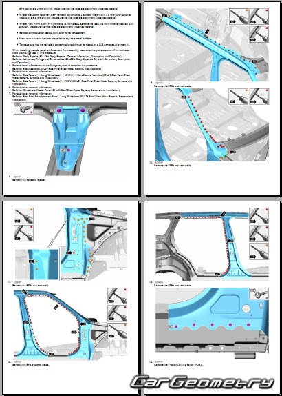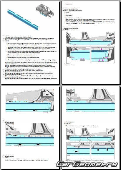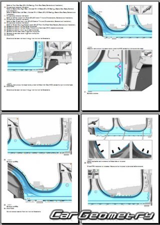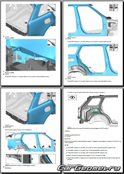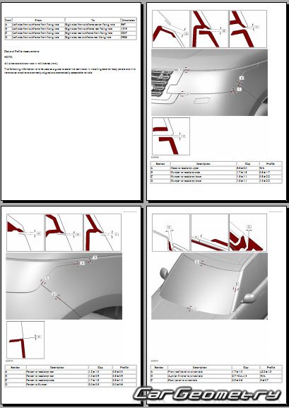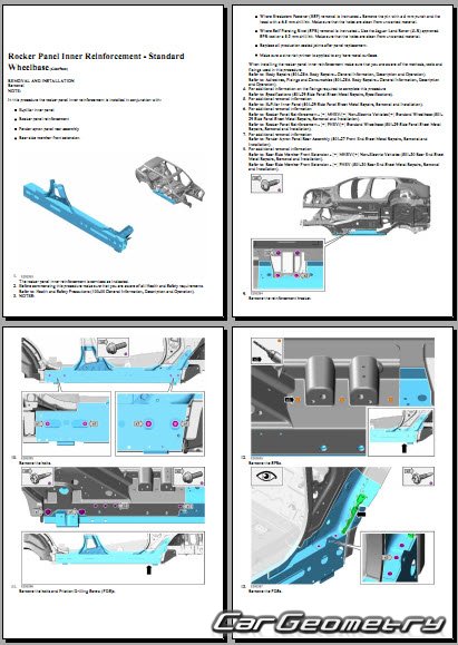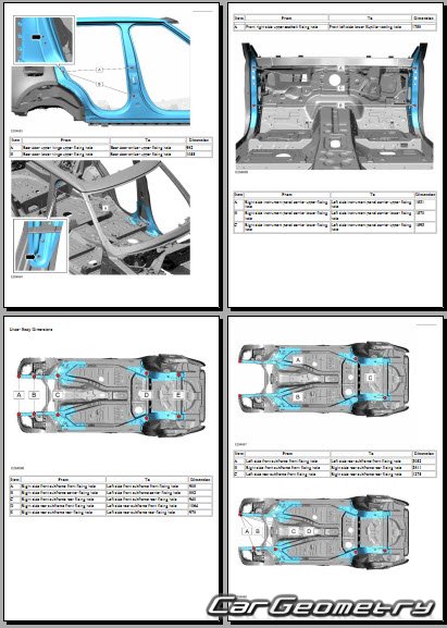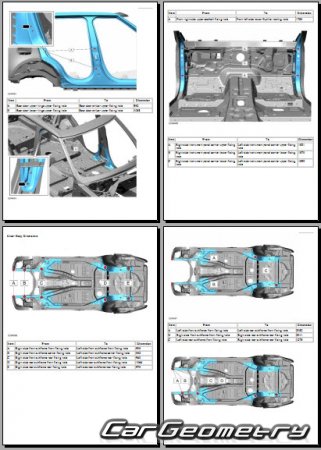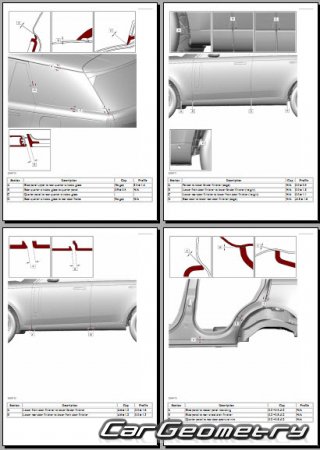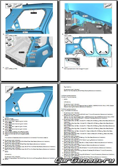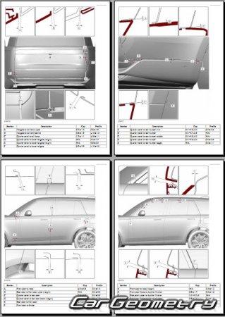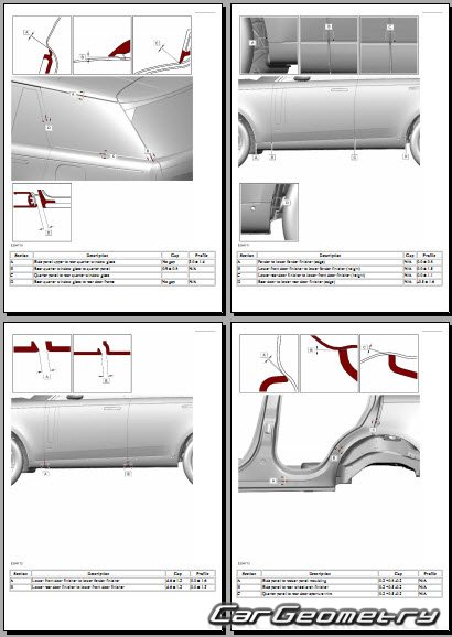 Information for the Range Rover L460 body geometric dimensions, control points, images of body elements, materials used, recommendations on applicable types, methods and materials for the welding points; places and materials for applying seam, soundproof and anti-corrosion sealants; points and directions for pre-cuts of body parts for the future installation of the new ones; types of interior materials, definitions and decoding.