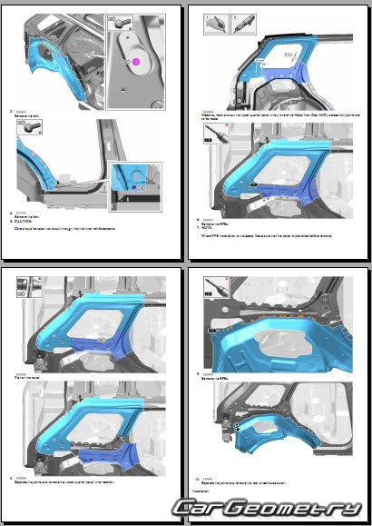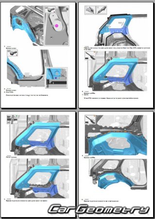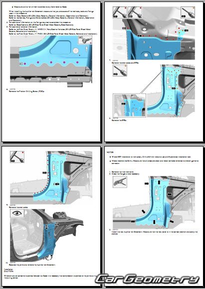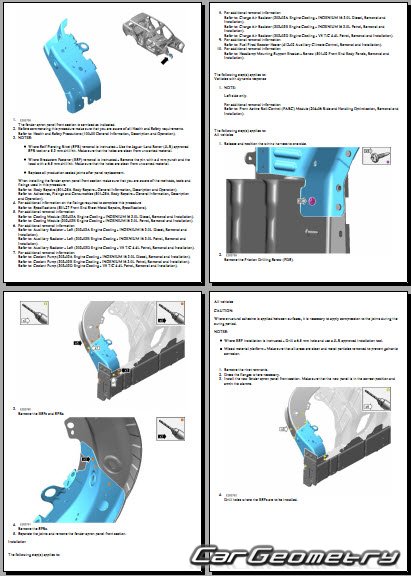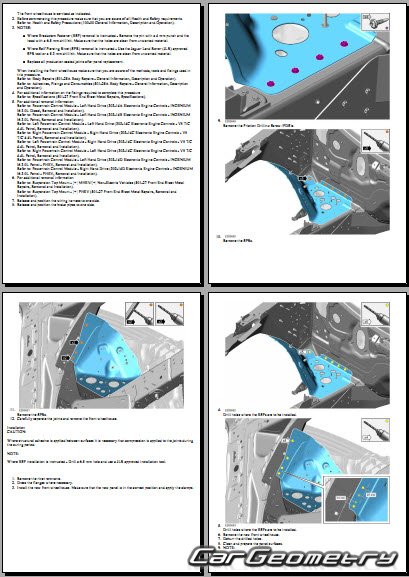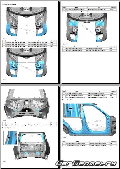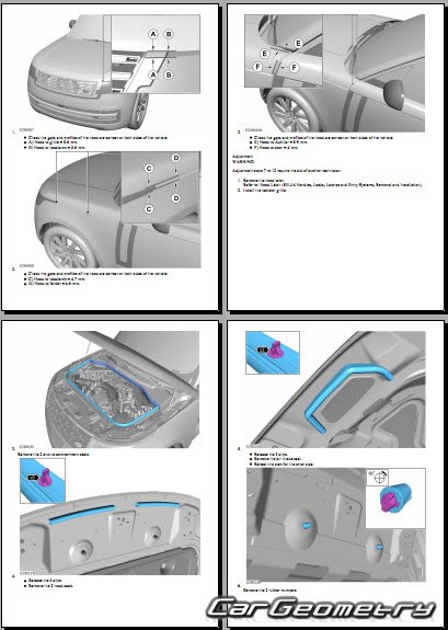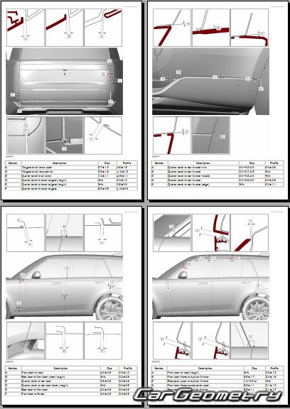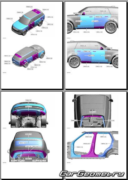 The factory body repair manual contains body dimensions for the Range Rover (L460) 2022-2028 and includes description of various body parts replacement, body dimension, control points for the Range Rover L460 (Standart and Long base).
