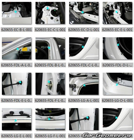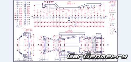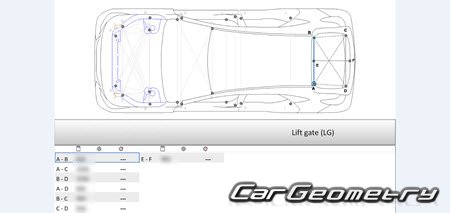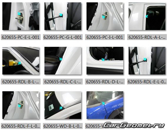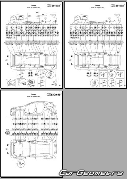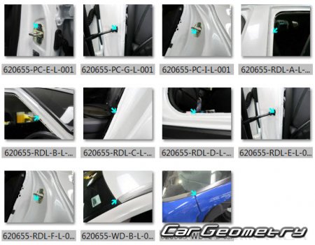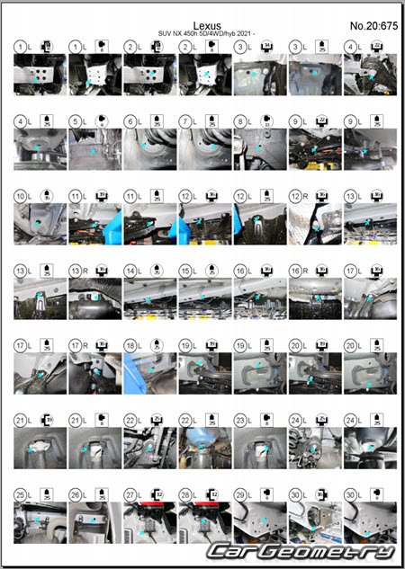Information for the Lexus NX450h+ 2021-2027 body geometric dimensions, control points, images of body elements, materials used, recommendations on applicable types, methods and materials for the welding points; places and materials for applying seam, soundproof and anti-corrosion sealants; points and directions for pre-cuts of body parts for the future installation of the new ones; types of interior materials, definitions and decoding.